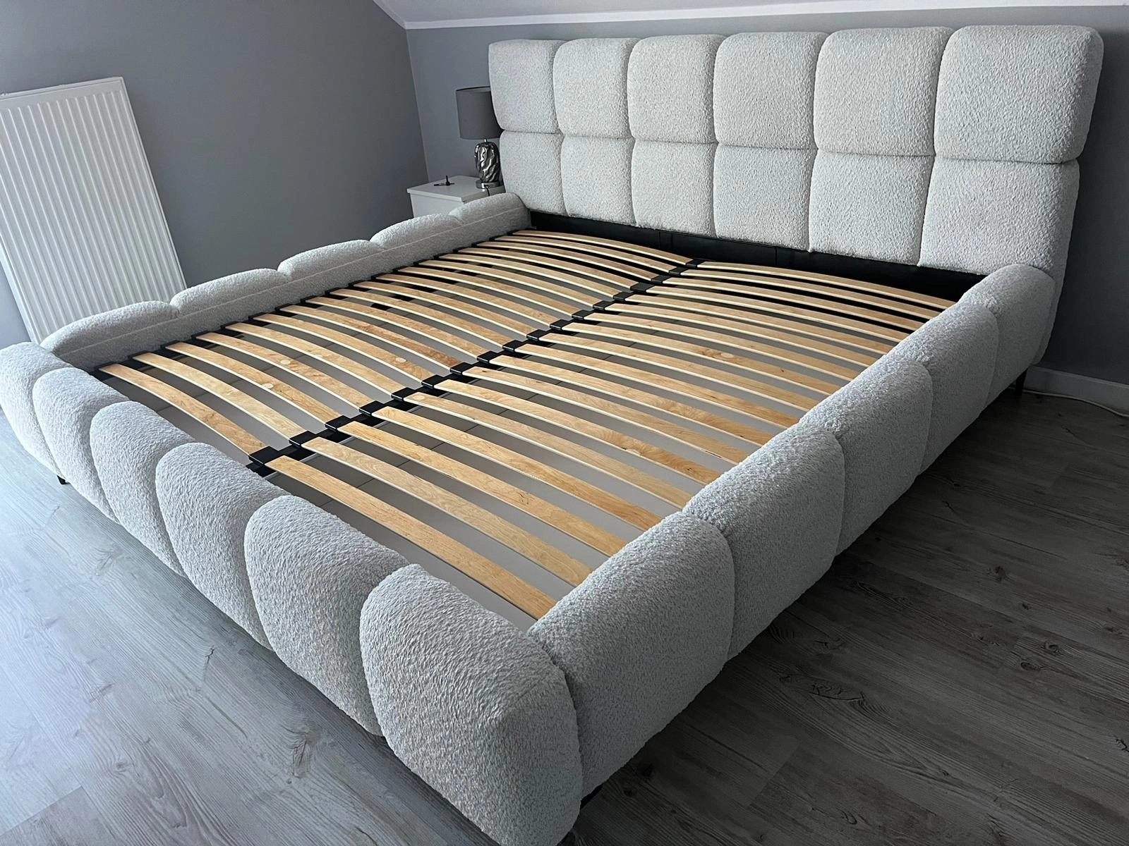 Das Modell Lux zeichnet sich durch ein originelles Kopfteil und Seitenpaneele aus, deren Form an zarte, weiche Wolken erinnert. Diese Lösung verleiht dem Innenraum Leichtigkeit und Gemütlichkeit und passt sowohl zu minimalistischen als auch zu klassischeren Schlafzimmerarrangements.