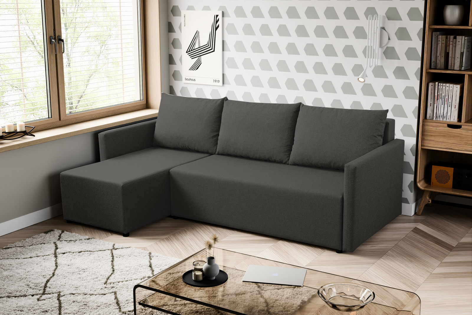 Das Möbelstück ist mit einer Schlaffunktion ausgestattet und verwandelt sich im Handumdrehen in ein bequemes Bett – ideal für Gäste oder den täglichen Komfort. Der zusätzliche Bettkasten spart Platz und sorgt für Ordnung im Wohnzimmer. Die klare Form und die weichen Rückenkissen machen das Sofa zu einer hervorragenden Wahl sowohl für kleine Wohnungen als auch für großzügige Räume. Die Möglichkeit, die Seite des Ecksofas zu wählen, erleichtert die Anpassung an das Raumlayout.