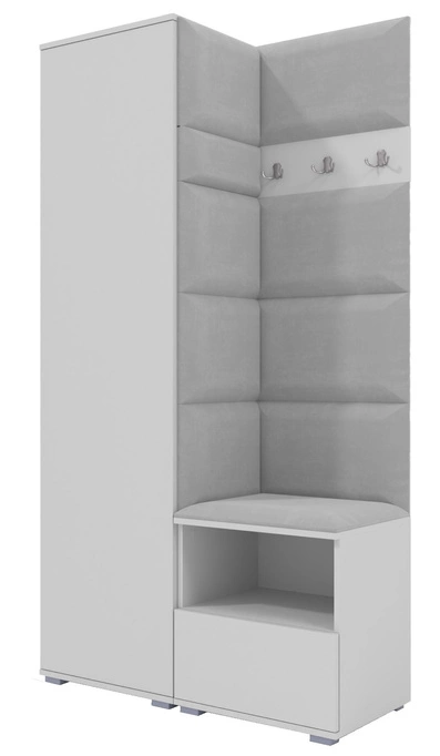- Stilvoller Garderoben-Set mit gepolsterten Paneelen in Weiß. Enthält einen hohen Schrank mit Kleiderstange, eine Sitzbank mit Schuhschrank und eine Kleiderstange mit Haken. Die ideale Wahl für alle, die Eleganz und Funktionalität schätzen.