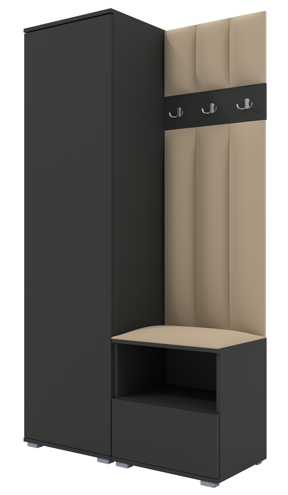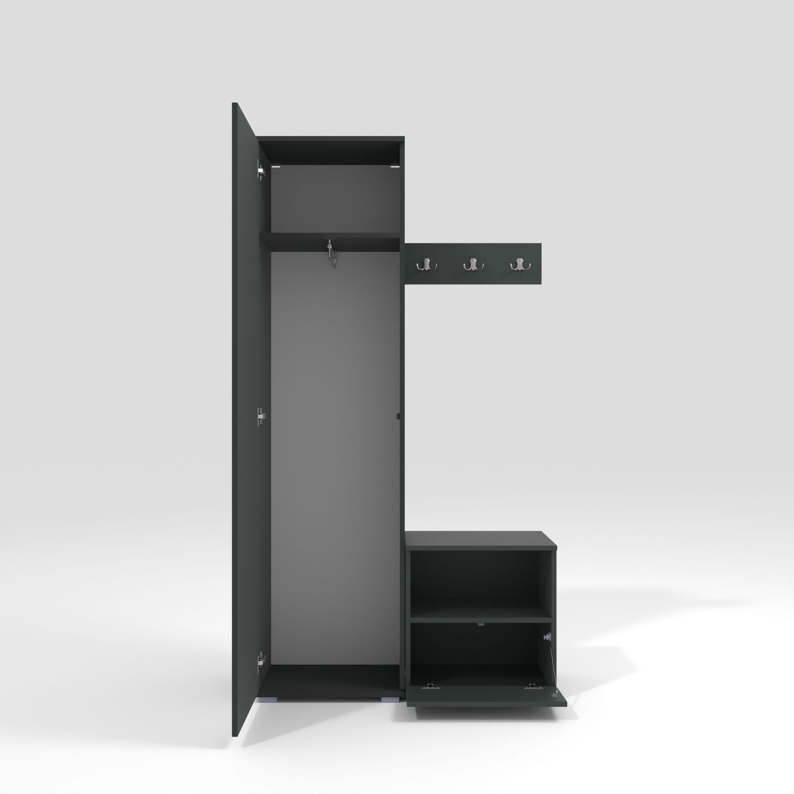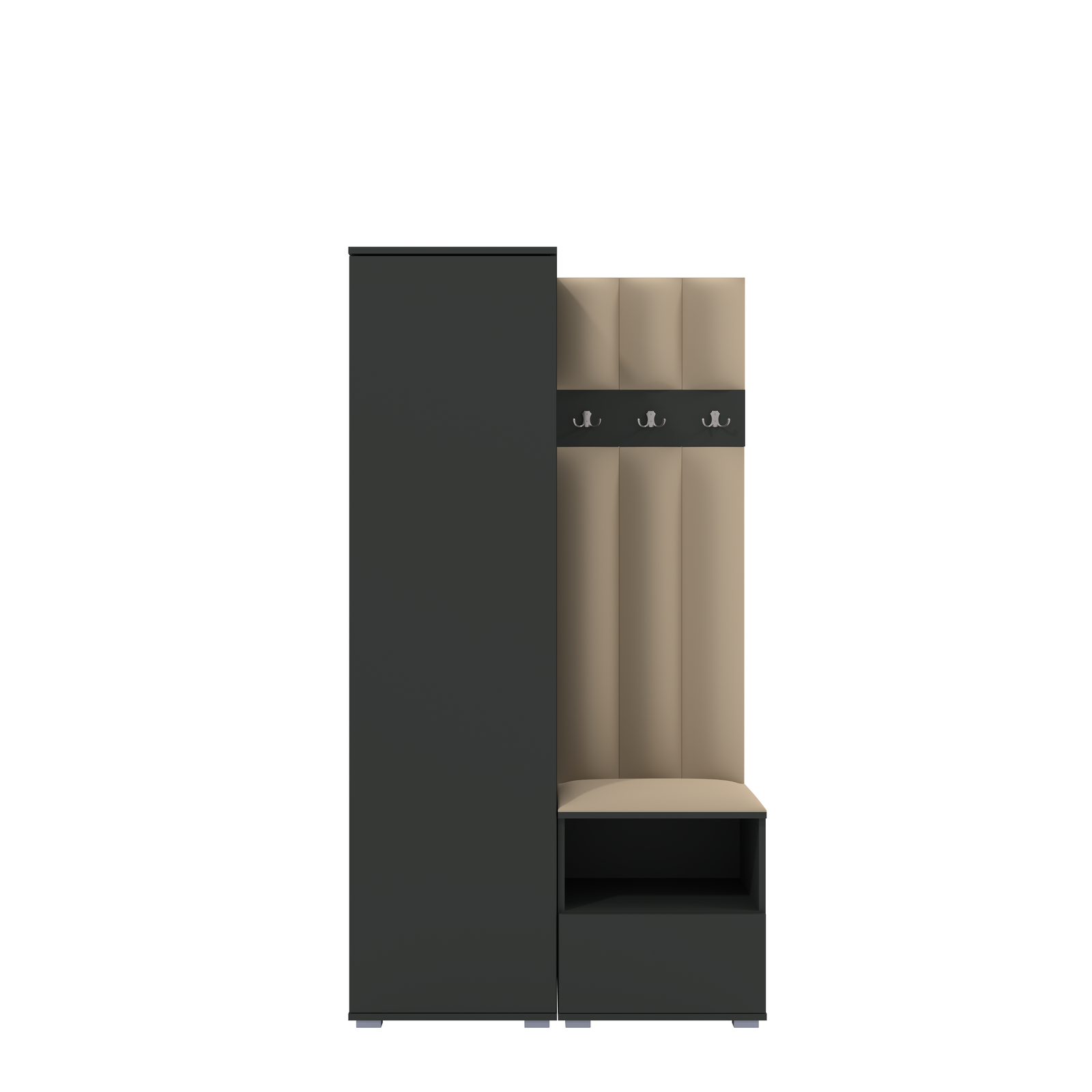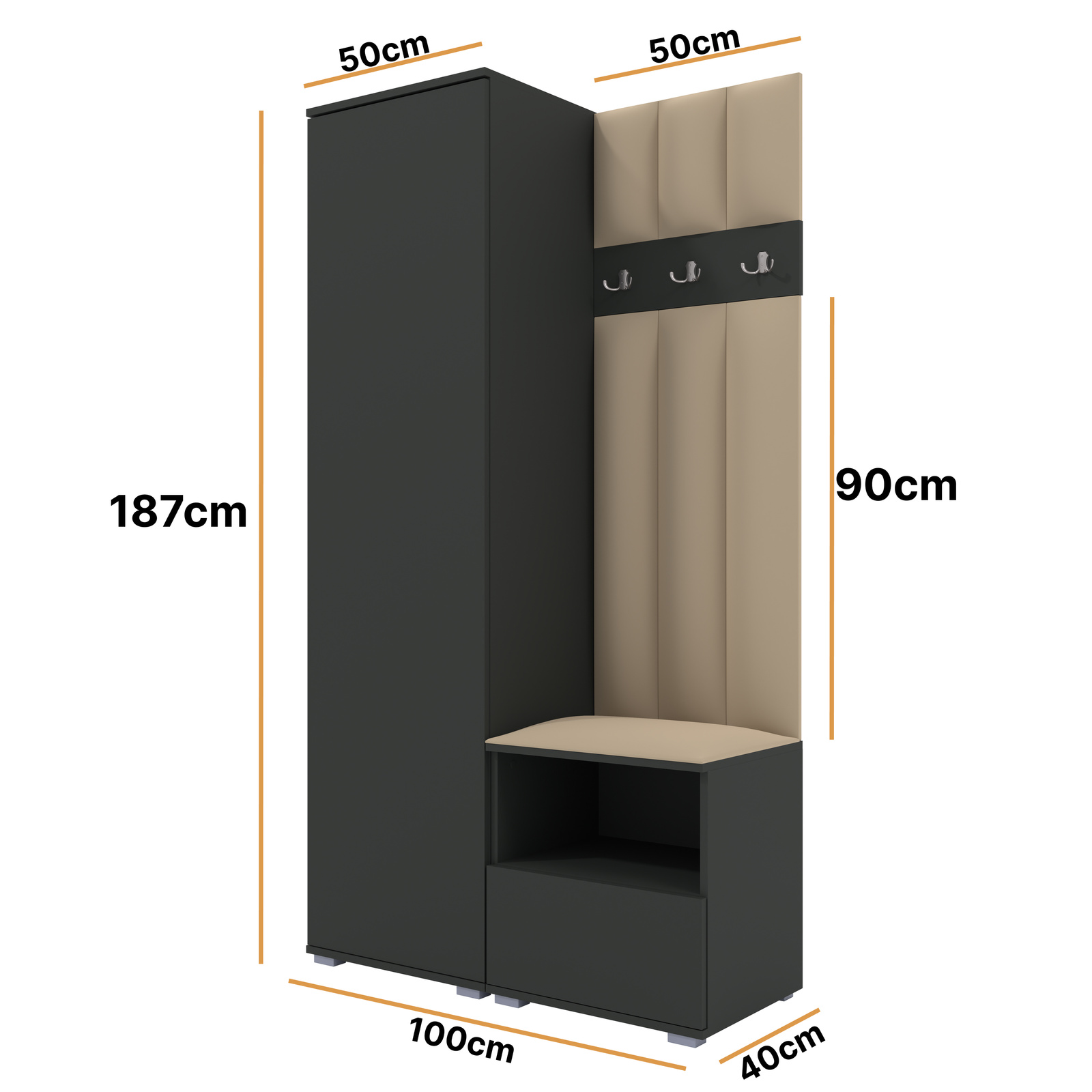 - Stilvoller Garderoben-Set in Graphit mit gepolsterten Paneelen. Mit hohem Schrank mit Kleiderstange, Sitzbank mit Schuhschrank und Kleiderhaken. Die ideale Wahl für alle, die Eleganz und Funktionalität schätzen.