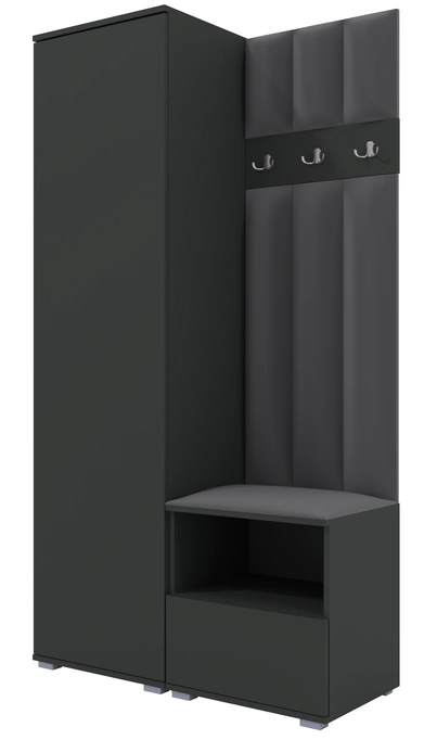 - Stilvoller Garderoben-Set in Graphit mit gepolsterten Velours-Paneelen. Mit hohem Schrank mit Kleiderstange, Sitzbank mit Schuhschrank und Kleiderhaken. Die ideale Wahl für alle, die Eleganz und Funktionalität schätzen.