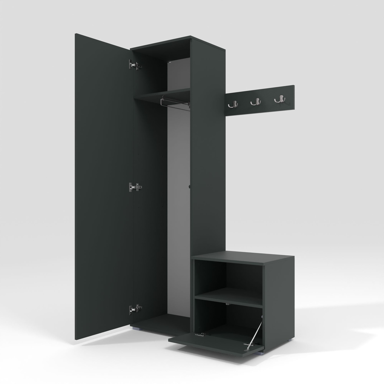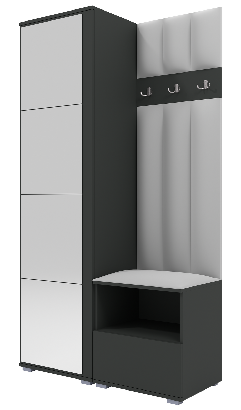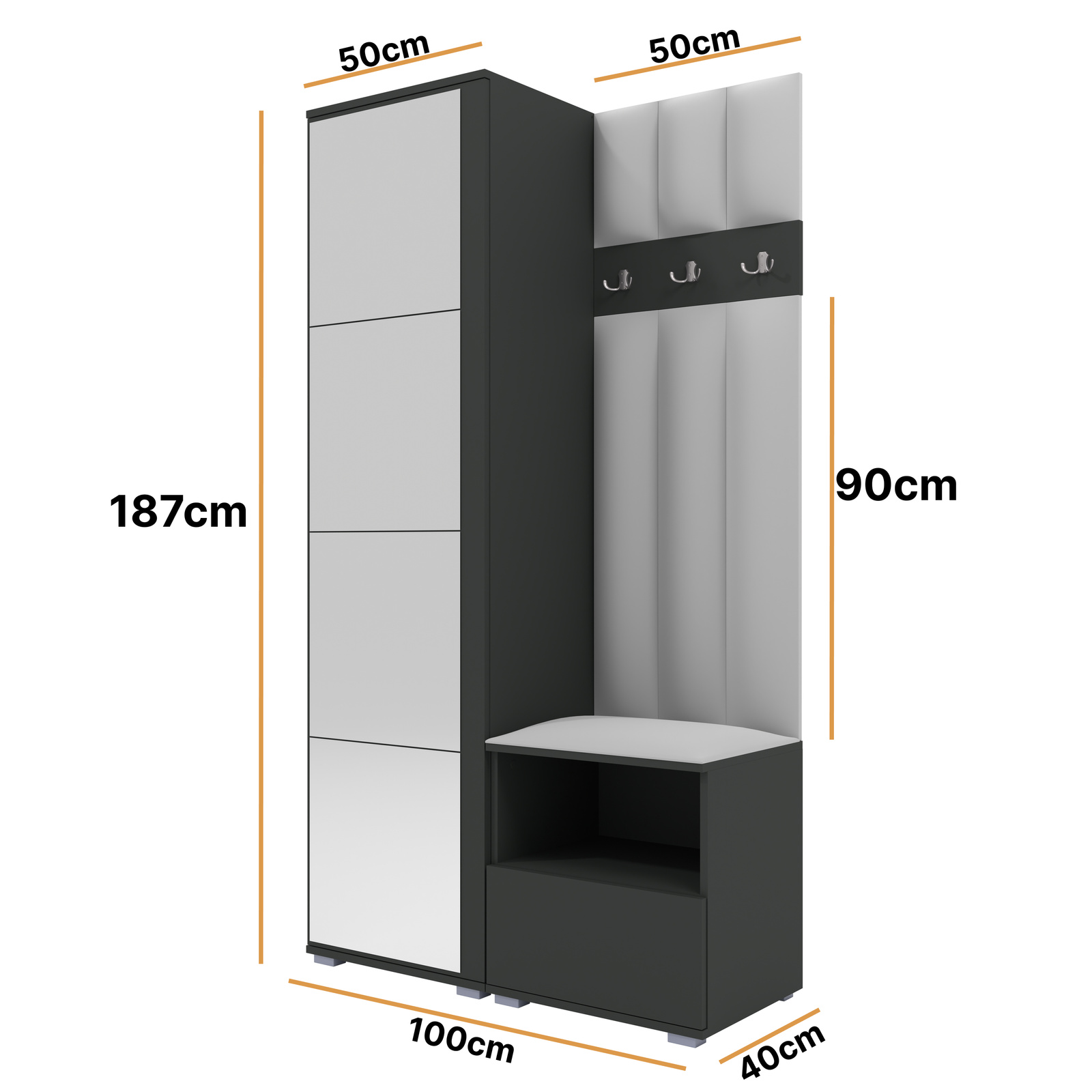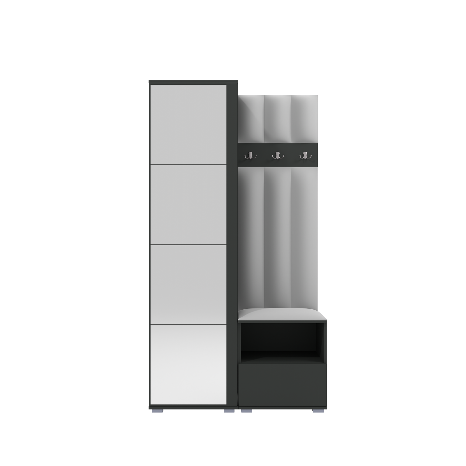 • Stilvoller Garderoben-Set mit gepolsterten Paneelen in Graphit. Mit hohem Schrank mit Spiegel, Sitzbank mit Schuhschrank und Kleiderhaken. Die ideale Wahl für alle, die Eleganz und Funktionalität schätzen.