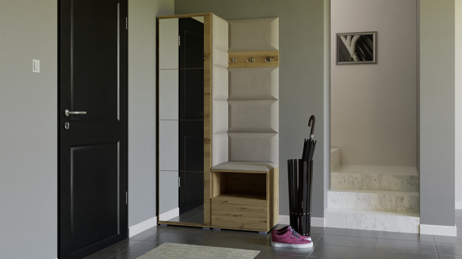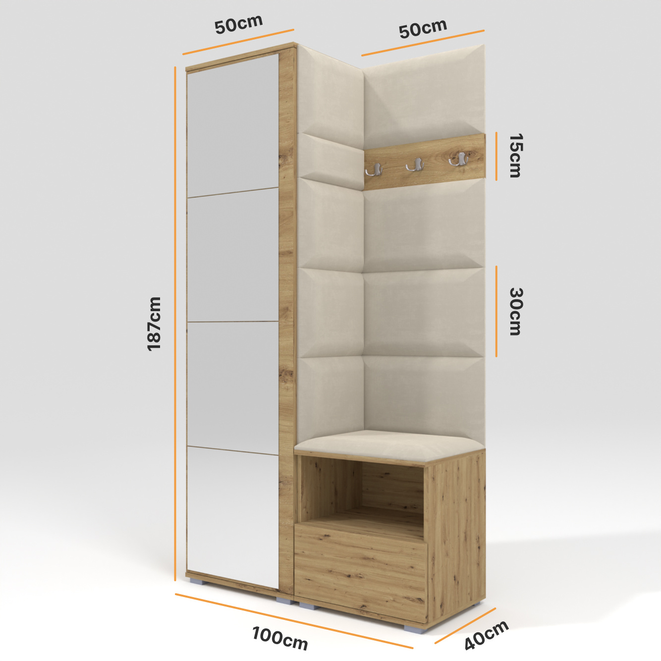 • Stilvoller Garderoben-Set mit gepolsterten Paneelen in Eiche Artisan. Enthält einen hohen Schrank mit Spiegel, eine Sitzbank mit Schuhschrank und einen Kleiderhaken. Die ideale Wahl für alle, die Eleganz und Funktionalität schätzen.