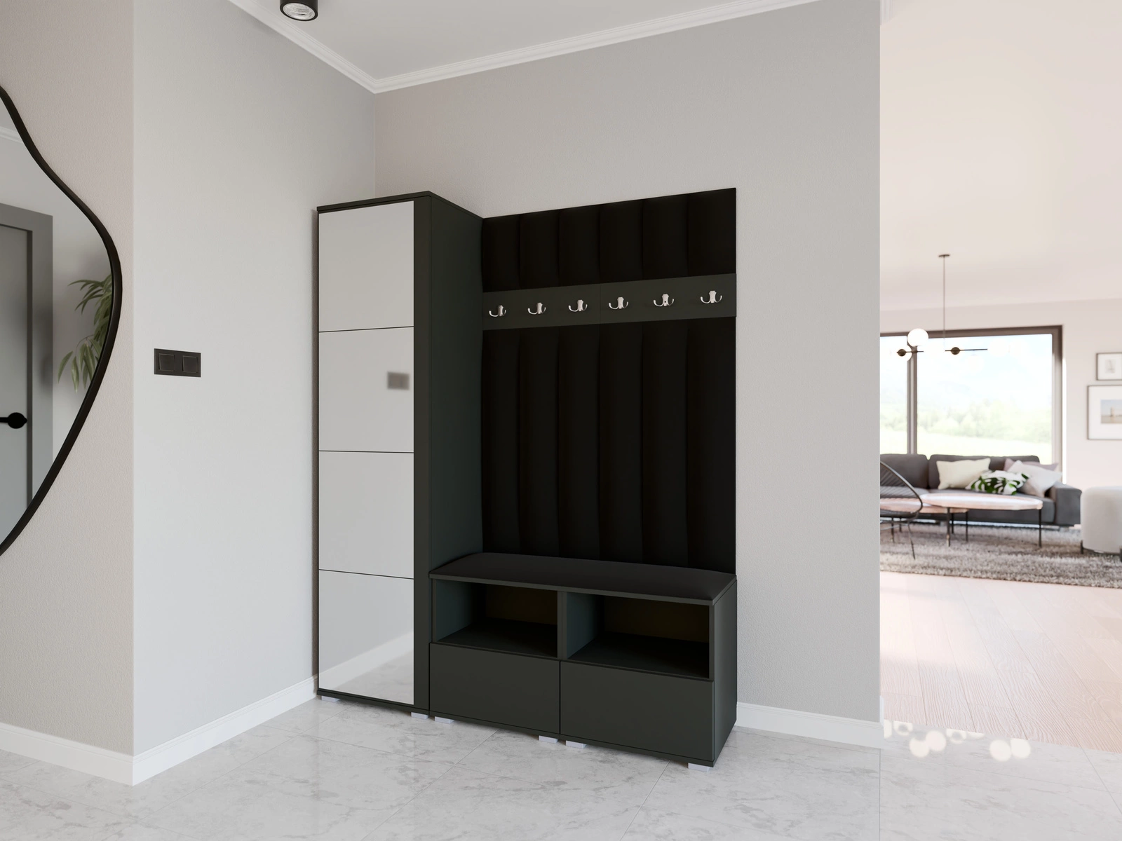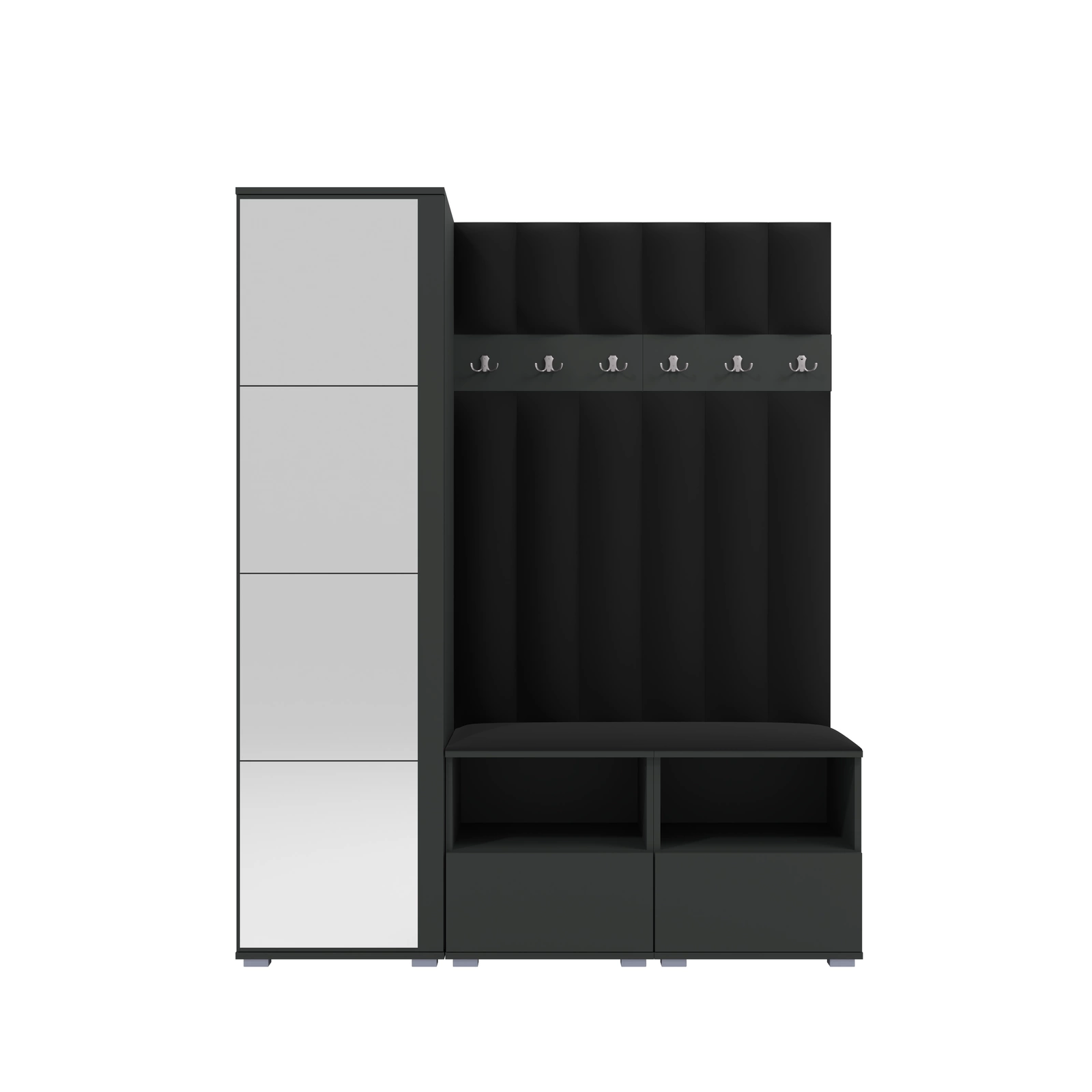 - Garderoben-Set in Graphit mit Spiegel und schwarz gepolsterten Paneelen. Mit hohem Schrank mit Kleiderstange, doppelter Sitzbank mit Schuhschrank und Kleiderhaken. Die ideale Wahl für alle, die Eleganz und Funktionalität schätzen.