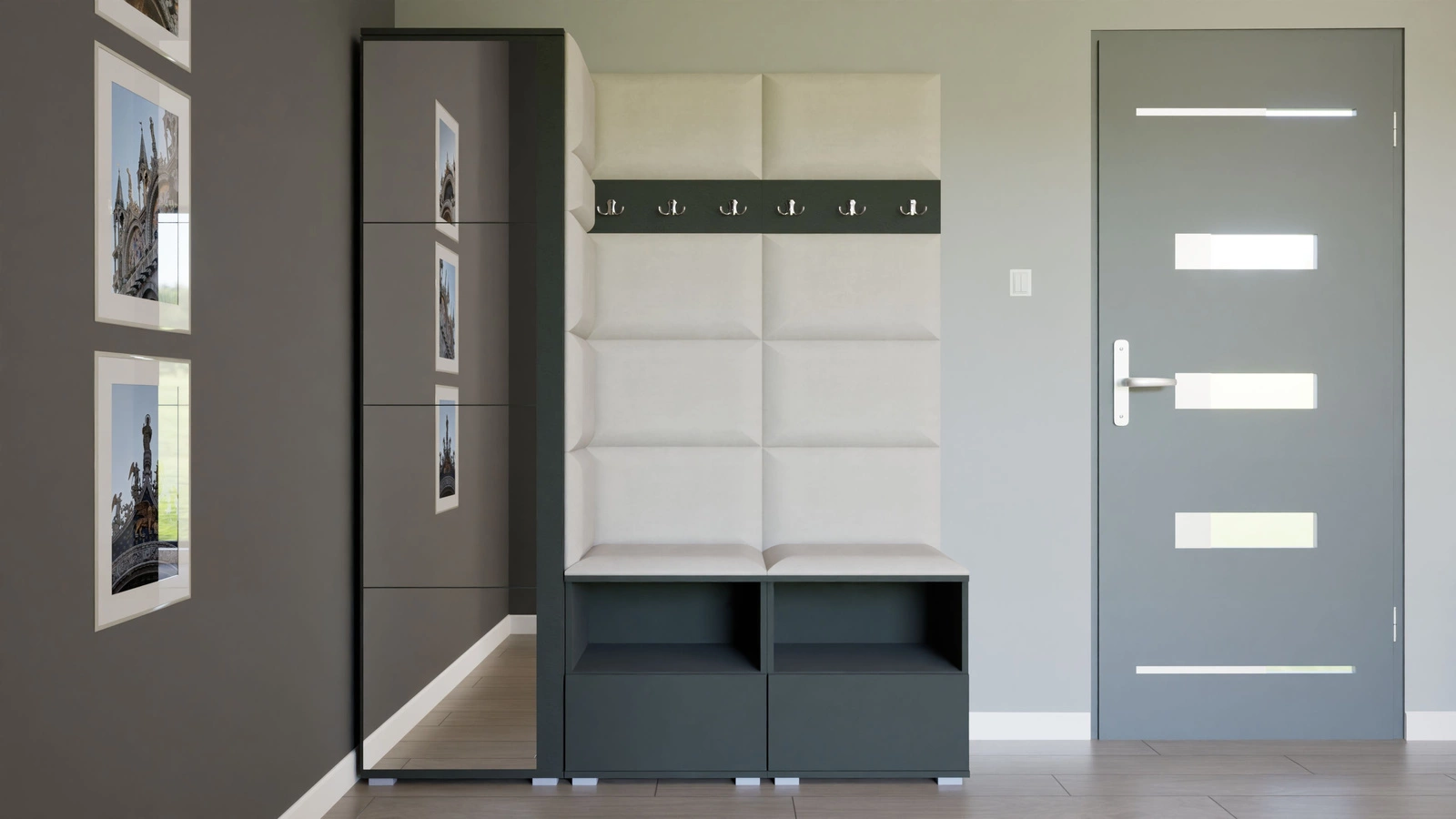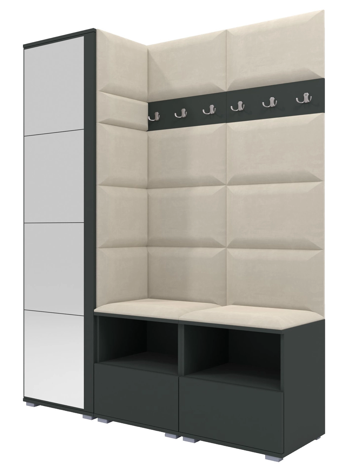 - Garderoben-Set in Graphit mit Spiegel und cremefarbenen Polsterpaneelen. Mit hohem Schrank mit Kleiderstange, doppelter Sitzbank mit Schuhschrank und Kleiderhaken. Die ideale Wahl für alle, die Eleganz und Funktionalität schätzen.