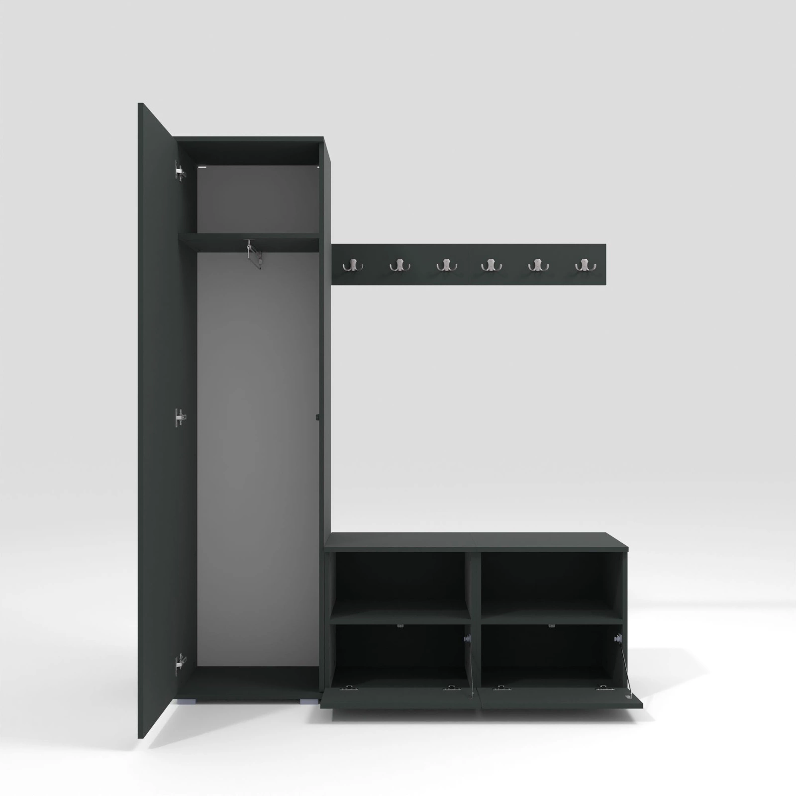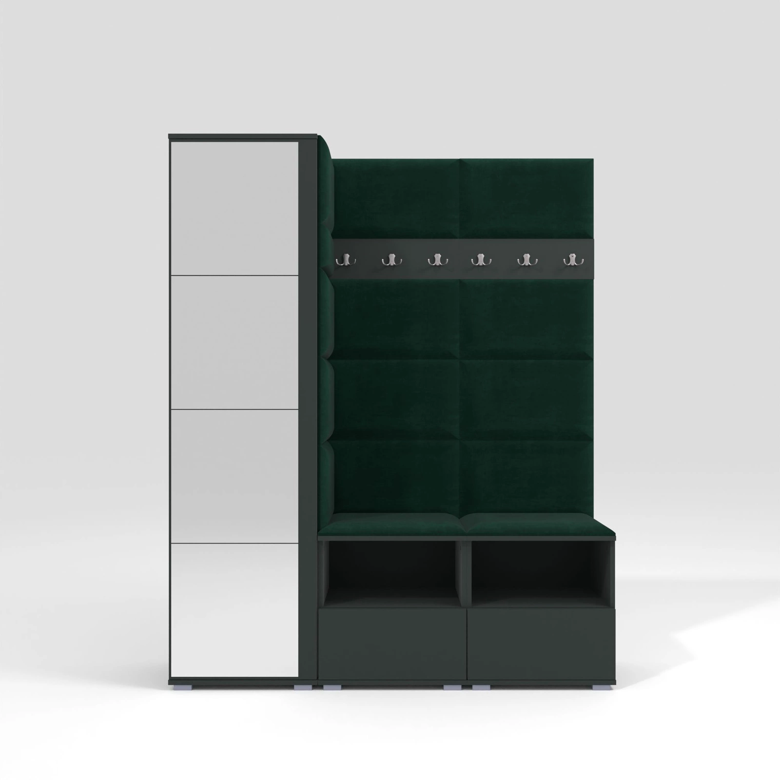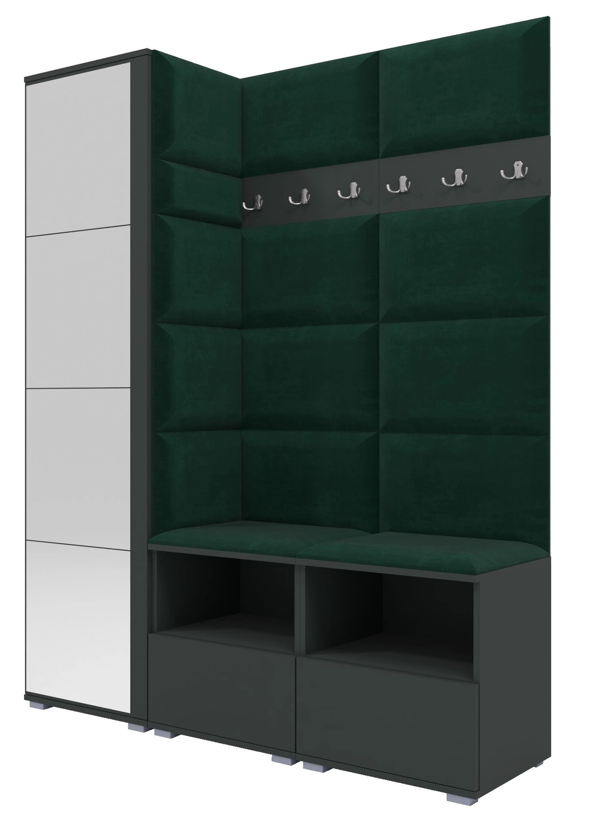- Garderoben-Set in Graphit mit Spiegel und grün gepolsterten Paneelen. Enthält einen hohen Schrank mit Kleiderstange, eine doppelte Sitzbank mit Schuhschrank und einen Kleiderhaken. Die ideale Wahl für alle, die Eleganz und Funktionalität schätzen.