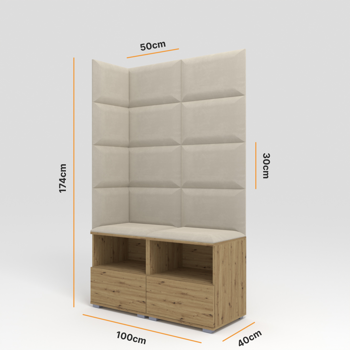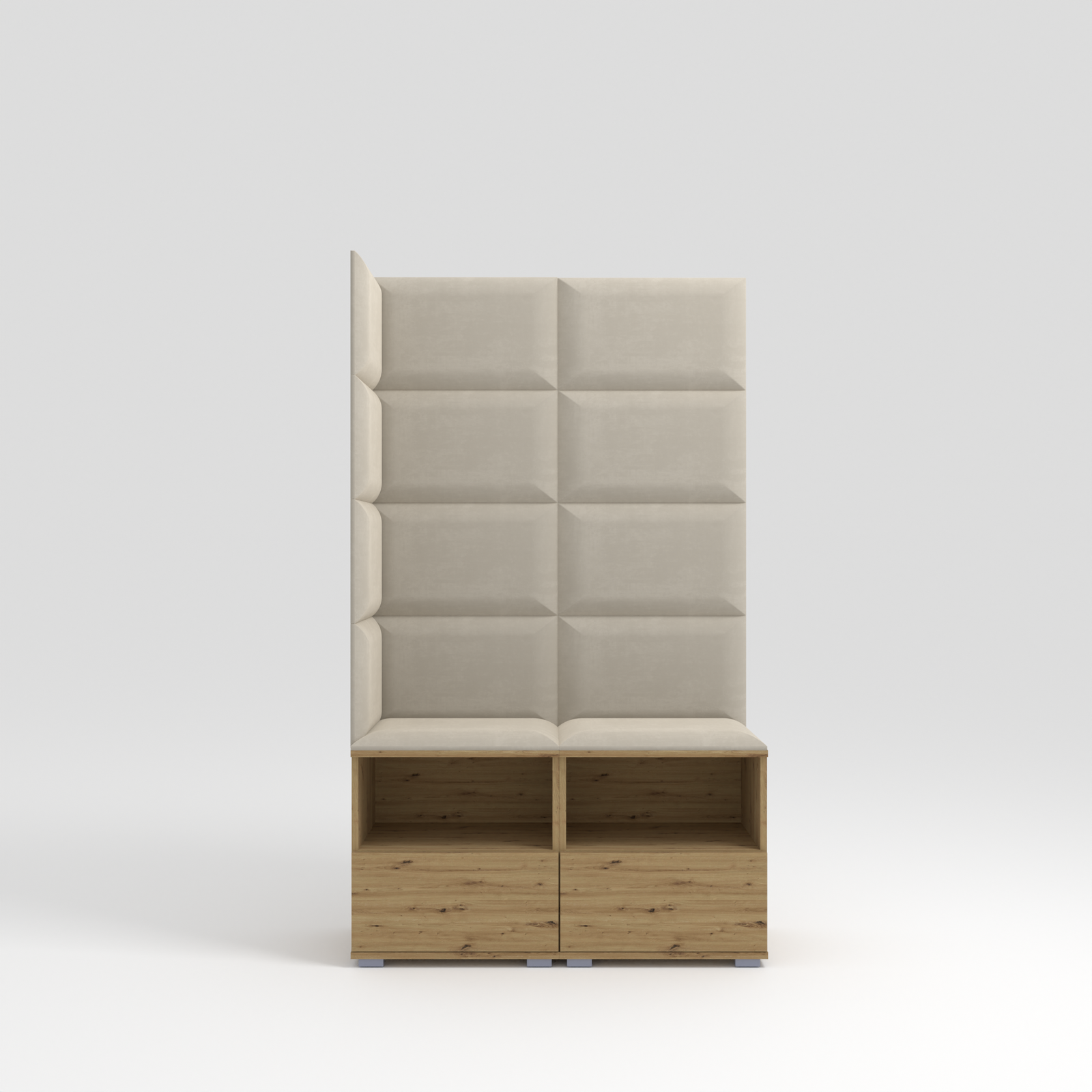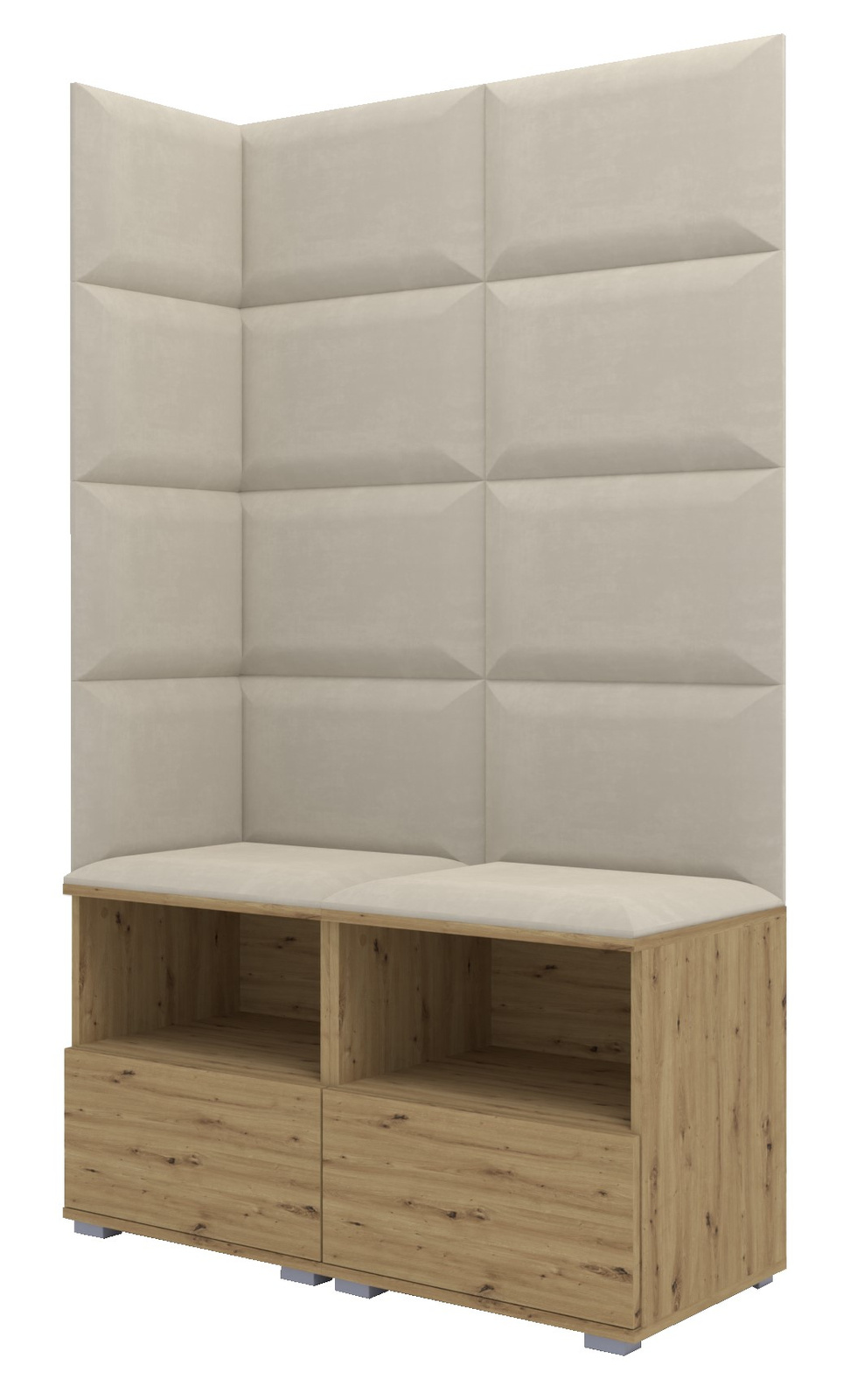 - Stilvoller Garderoben-Set in Eiche Artisan mit cremefarbenen Polsterpaneelen. Mit doppelter Sitzbank und Schuhschrank. Die ideale Wahl für alle, die kompakte Eleganz und Funktionalität schätzen.