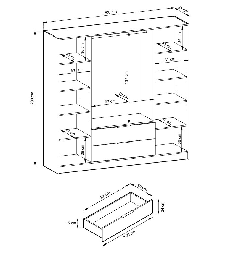 Der Innenraum des Schranks wurde so gestaltet, dass er ein Maximum an Funktionalität und Komfort bietet. Der mittlere Teil ist ein Bereich mit einer Kleiderstange, ideal für die Aufbewahrung von Alltagskleidung – von Mänteln bis hin zu empfindlichen Hemden. Darunter befinden sich zwei breite Schubladen, in denen Sie alles unterbringen können, was Sie immer griffbereit haben möchten. An den Seiten befinden sich zahlreiche Regalböden – ein praktischer und leicht zugänglicher Platz für Pullover, Jeans, Accessoire-Boxen oder saisonale Kleidung. Abgerundet wird das Ganze durch moderne schwarze Griffe, die einen dezenten Kontrast zur grauen Oberfläche der Fronten bilden.