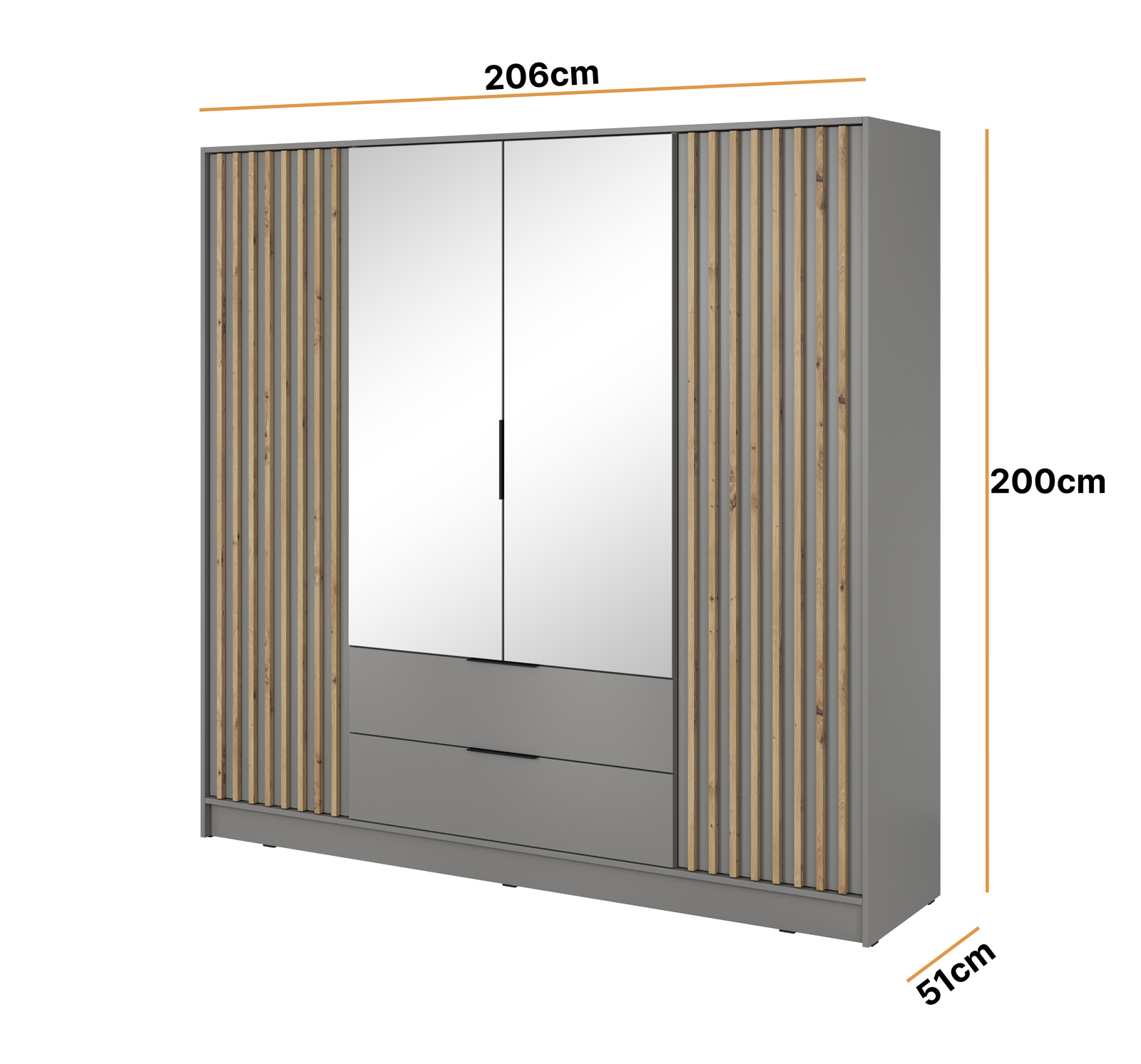 Der Schrank Stilo 4D ist die Antwort auf die Bedürfnisse all derer, die ein geräumiges und stilvolles Möbelstück zur Aufbewahrung suchen. Seine moderne Form mit klaren Linien wird durch vertikale Holzlamellen in Eiche Artisan ergänzt, die den minimalistischen Charakter des matten Graus erwärmen. Diese Kombination aus Farben und Strukturen passt perfekt zu den aktuellen Einrichtungstrends und eignet sich sowohl für das Schlafzimmer als auch für den Kleiderschrank oder einen modernen Flur.