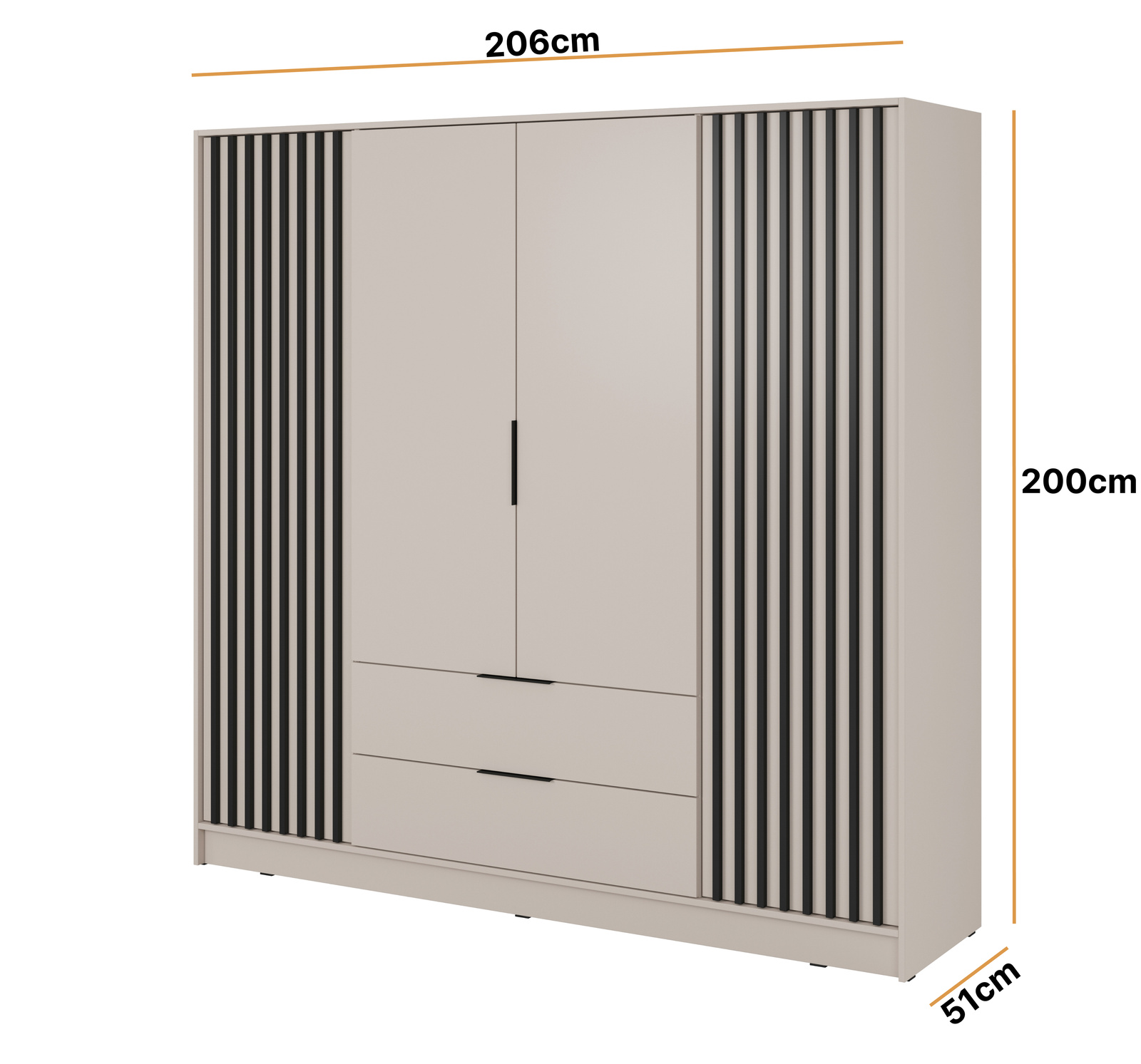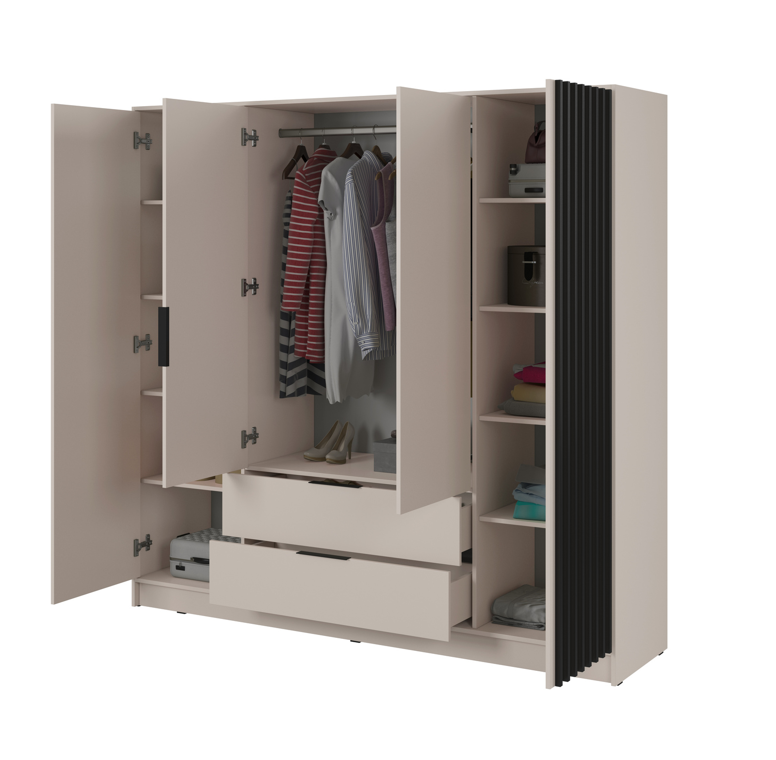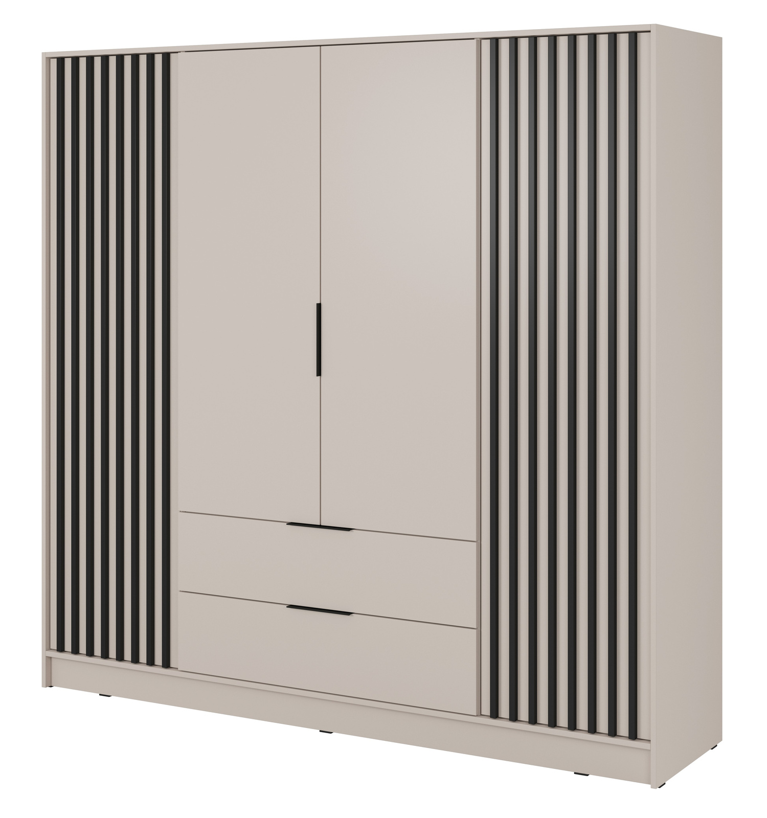 Garderobenschrank Stilo in Kaschmirfarbe mit vier Türen, Schubladen und Lamellen an der Vorderseite