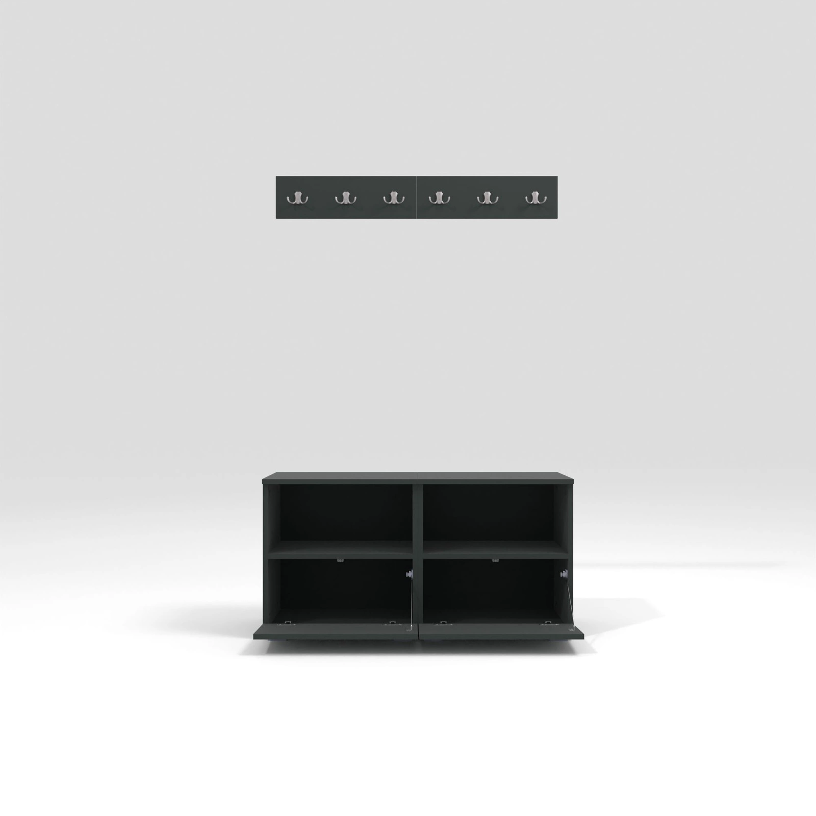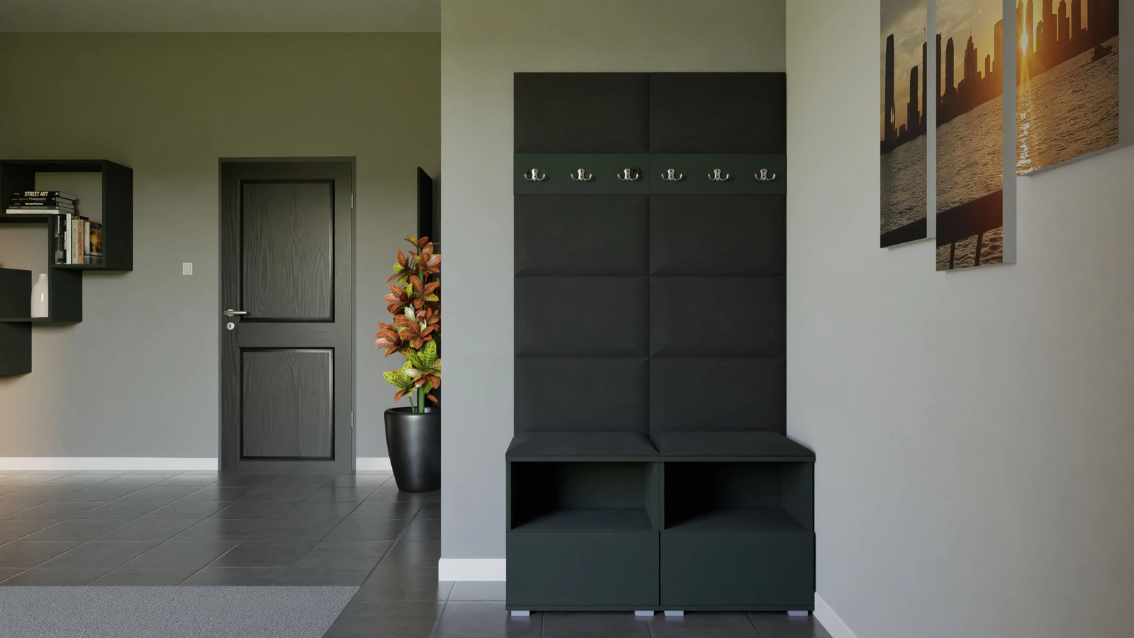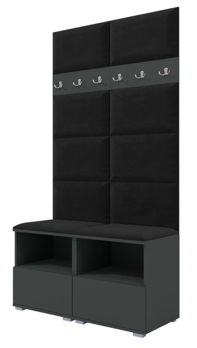 - Stilvoller, graphitfarbener Garderoben-Set mit schwarz gepolsterten Paneelen. Mit doppelter Sitzbank mit Schuhfach und Kleiderhaken. Die ideale Wahl für alle, die kompakte Eleganz und Funktionalität schätzen.