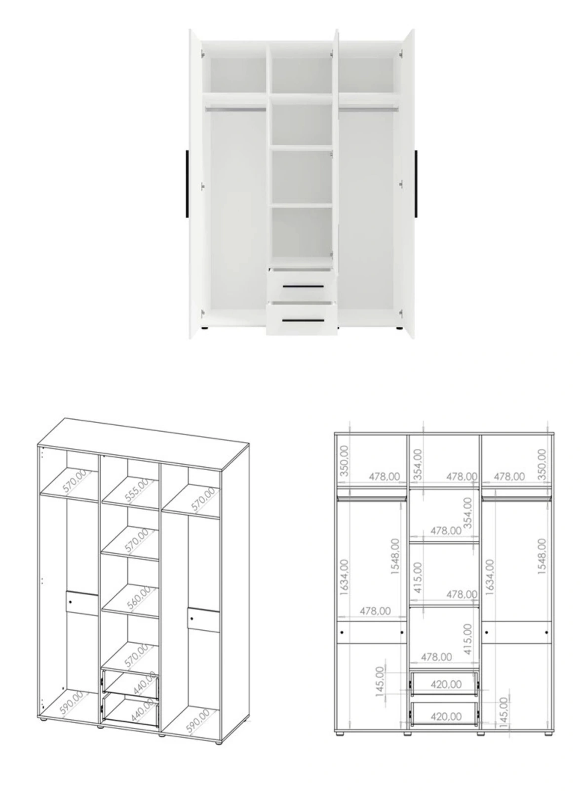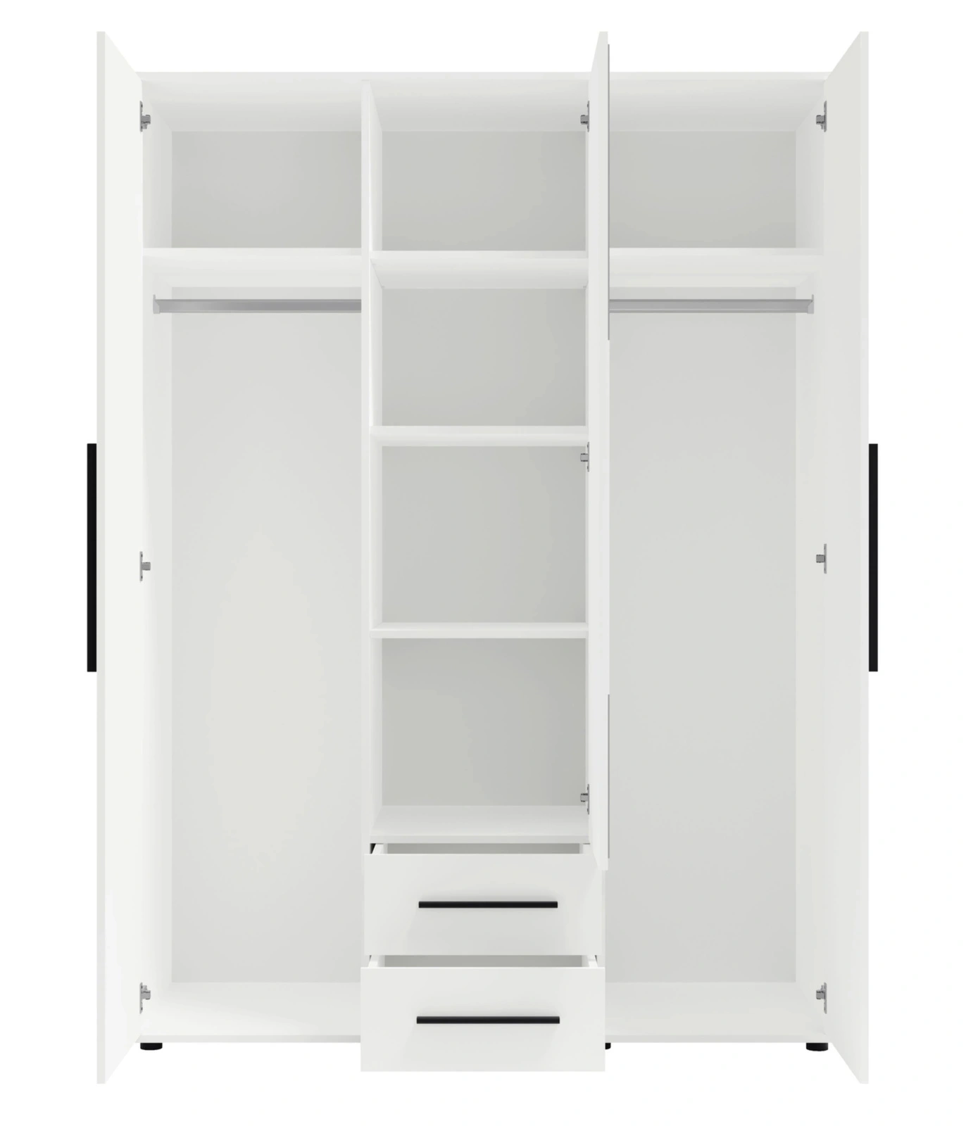 Der Innenraum des Schranks wurde für maximale Stauraumkomfort konzipiert. Hier finden Sie zwei Kleiderstangen an den Seiten, zahlreiche Regalböden in der Mitte und zwei praktische Schubladen für Kleinigkeiten oder Unterwäsche. Diese Anordnung ermöglicht eine perfekte Organisation Ihrer Kleidung, von Hemden und Kleidern bis hin zu komplexen Pullovern, Jeans oder Accessoires. Der Schrank zeichnet sich durch eine solide Konstruktion und sorgfältige Verarbeitung aus, die eine lange Lebensdauer garantieren.