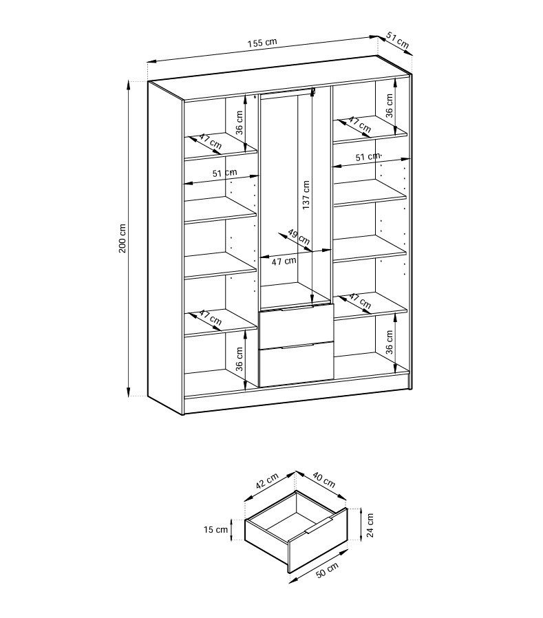 Der Innenraum des Schranks wurde für maximalen Komfort konzipiert. Der mittlere Teil ist mit einer Kleiderstange ausgestattet – ideal für Hemden, Jacken oder Kleider. Auf beiden Seiten befinden sich zahlreiche Regale, die sich für Kleidung, Accessoire-Boxen oder saisonale Garderobe eignen. Ein weiterer Vorteil sind zwei geräumige Schubladen im unteren Bereich, die einen schnellen Zugriff auf Unterwäsche oder kleine Alltagsgegenstände ermöglichen.