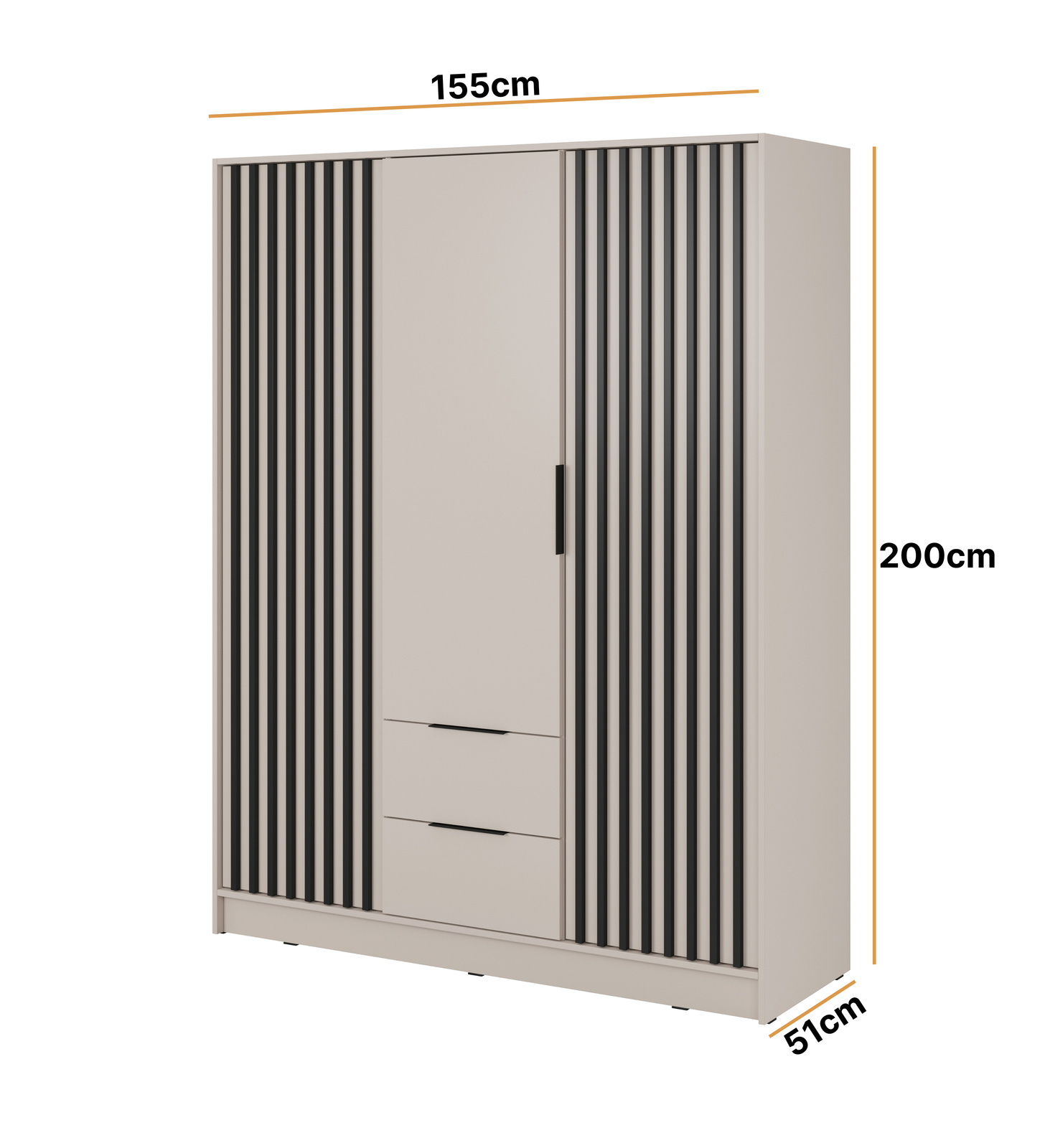 Der Schrank Stilo 3D ist die ideale Lösung für alle, die mehr Stauraum benötigen, aber nicht auf Stil verzichten möchten. Sein kaschmirfarbener, matter Korpus mit dekorativen Einsätzen in Schwarz bildet eine moderne, elegante Form, die sich hervorragend in Schlafzimmern, Ankleidezimmern oder Fluren macht. Vertikale Lamellen mit natürlicher Holzmaserung durchbrechen die Kühle des Kaschmirfarbtons und verleihen dem Möbelstück Charakter.
