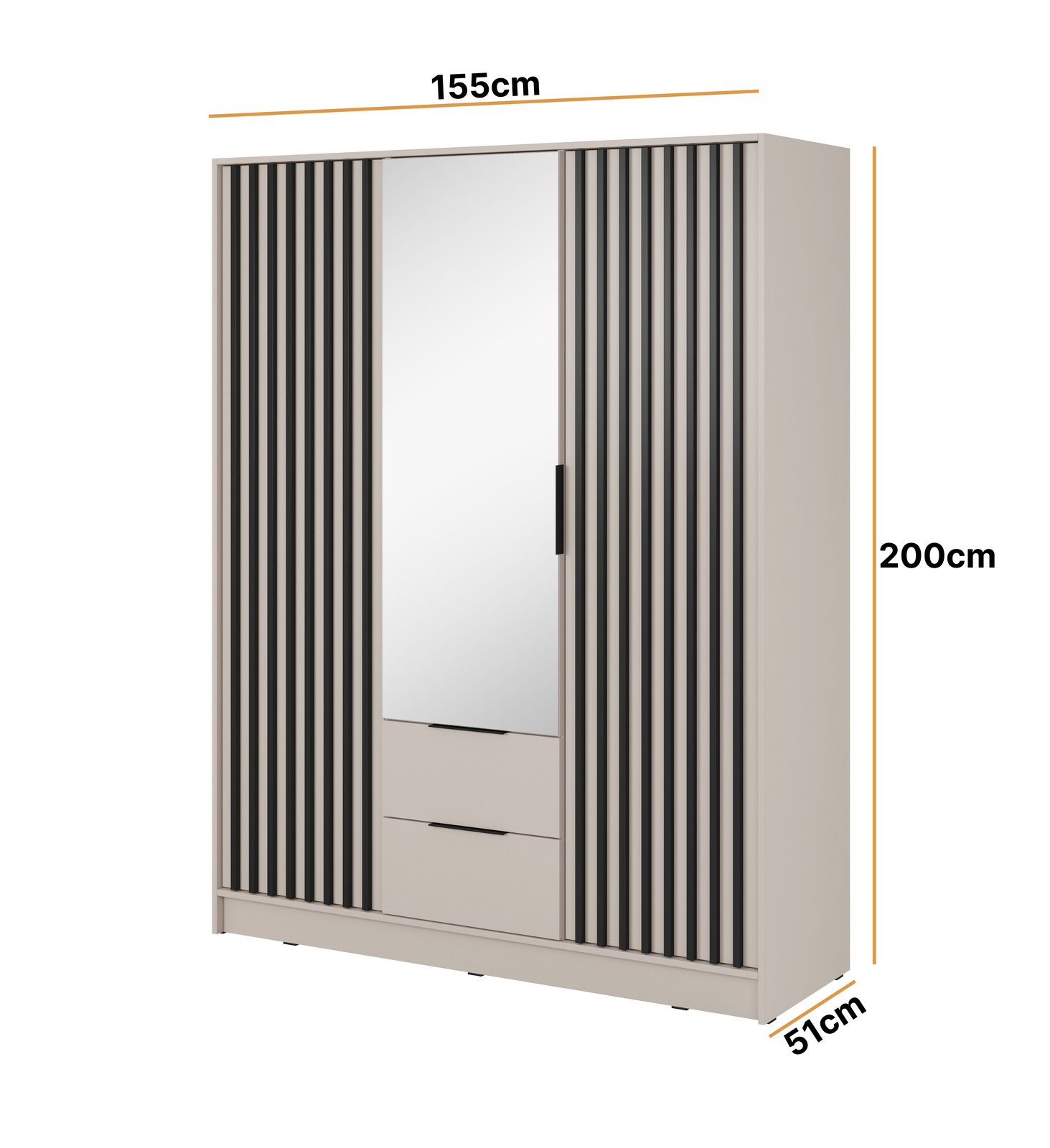 Der Kleiderschrank Stilo 3D ist die ideale Lösung für alle, die mehr Stauraum benötigen, aber nicht auf Stil verzichten möchten. Sein kaschmirfarbener, matter Korpus mit dekorativen Einsätzen in Schwarz bildet eine moderne, elegante Form, die sich hervorragend in Schlafzimmer, Ankleidezimmer oder Flur einfügt. Vertikale Lamellen mit natürlicher Holzmaserung durchbrechen die Kühle des Kaschmirs und verleihen dem Möbelstück Charakter.