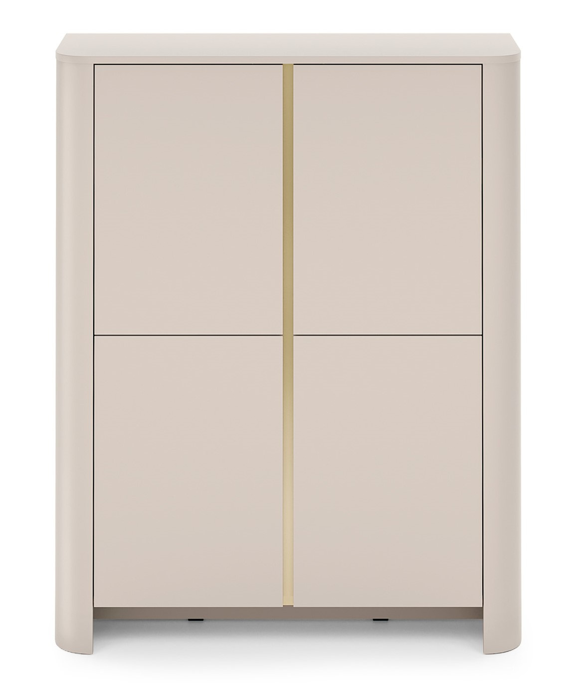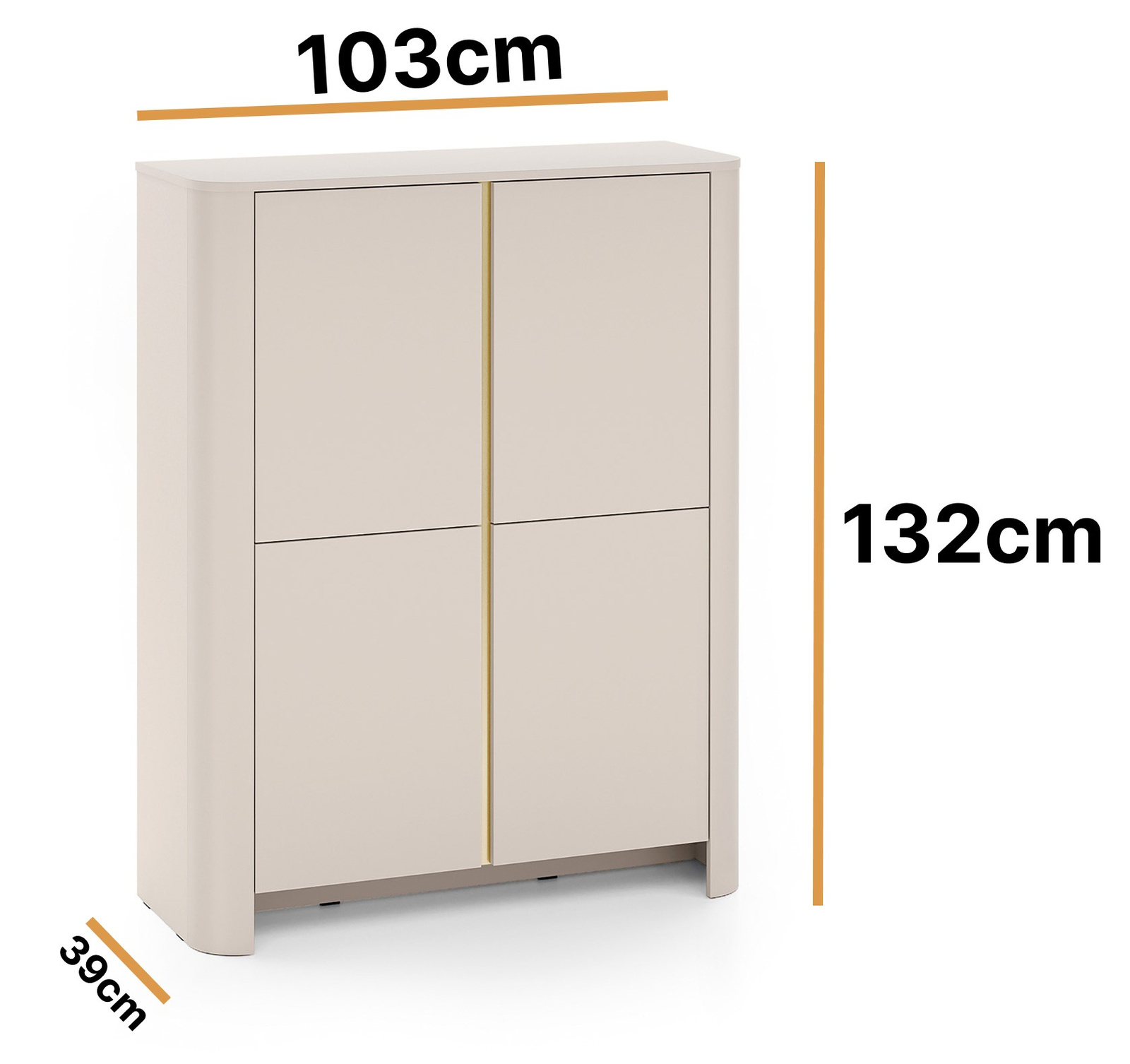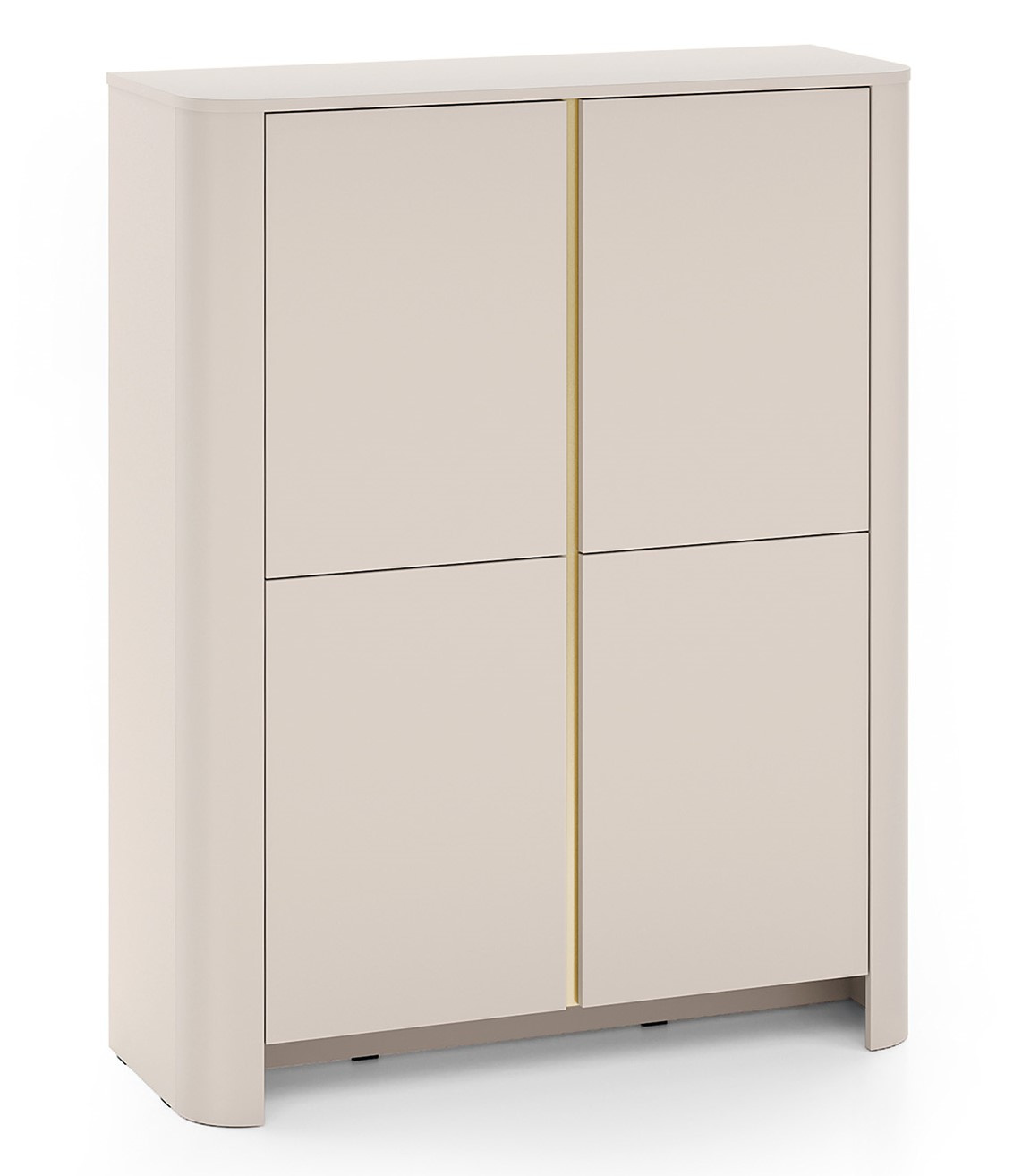 - Die elegante und moderne Kommode Aura in Kaschmirfarbe mit goldenen Akzenten ist die perfekte Kombination aus minimalistischer Form und einem Hauch von Luxus. Die geräumigen Regale hinter vier Fronten helfen Ihnen, Ordnung in Ihrem Wohnzimmer, Schlafzimme
