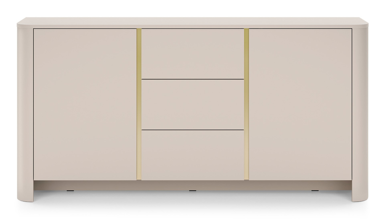 - Moderne Kommode Aura in eleganter Kaschmirfarbe mit dezenten goldenen Akzenten. Praktische Schränke und Schubladen sorgen für komfortable Aufbewahrung, während abgerundete Kanten dem Innenraum Leichtigkeit verleihen.