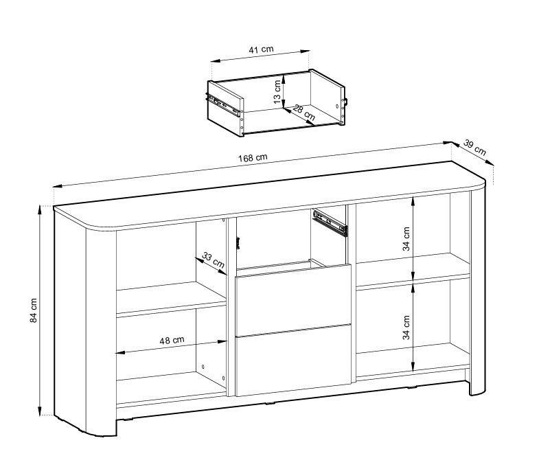 Die Kommode Aura ist eine Kombination aus moderner Form und eleganter, subtiler Verarbeitung in der Farbe Kaschmir. Charakteristische Merkmale dieses Möbelstücks sind die abgerundeten Kanten und die zarten, goldenen Einsätze, die dem Ganzen Klasse und Raffinesse verleihen. Dieses Modell bietet nicht nur ein attraktives Design, sondern auch praktische Lösungen für den täglichen Gebrauch – geräumige Schränke und drei Schubladen bieten Platz für alle notwendigen Dinge und helfen, Ordnung im Wohn- oder Esszimmer zu halten.