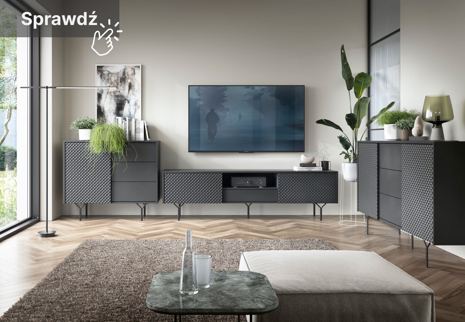 Eines der auffälligsten Merkmale dieser Kommode ist die geriffelte Front mit 3D-Effekt, die ihr einen einzigartigen Charakter und Tiefe verleiht. Dieses Möbelstück wird mit Sicherheit die Blicke auf sich ziehen und eine einzigartige Atmosphäre in Ihrem Interieur schaffen. Das innovative „Push-to-open”-System macht die Benutzung dieser Kommode äußerst einfach und bequem – Sie öffnen die Kommode mühelos, indem Sie leicht auf die Front der Tür oder Schublade drücken.