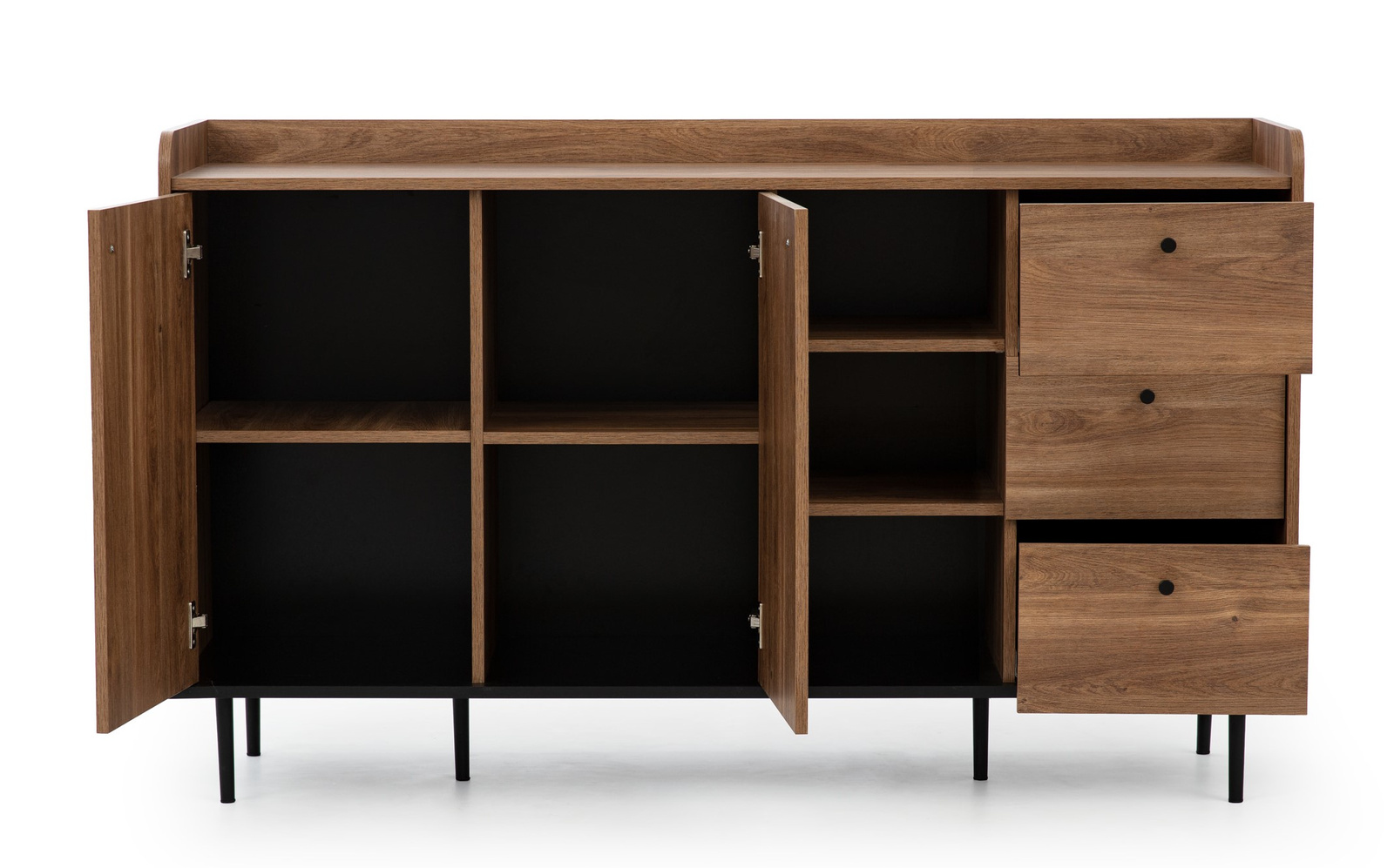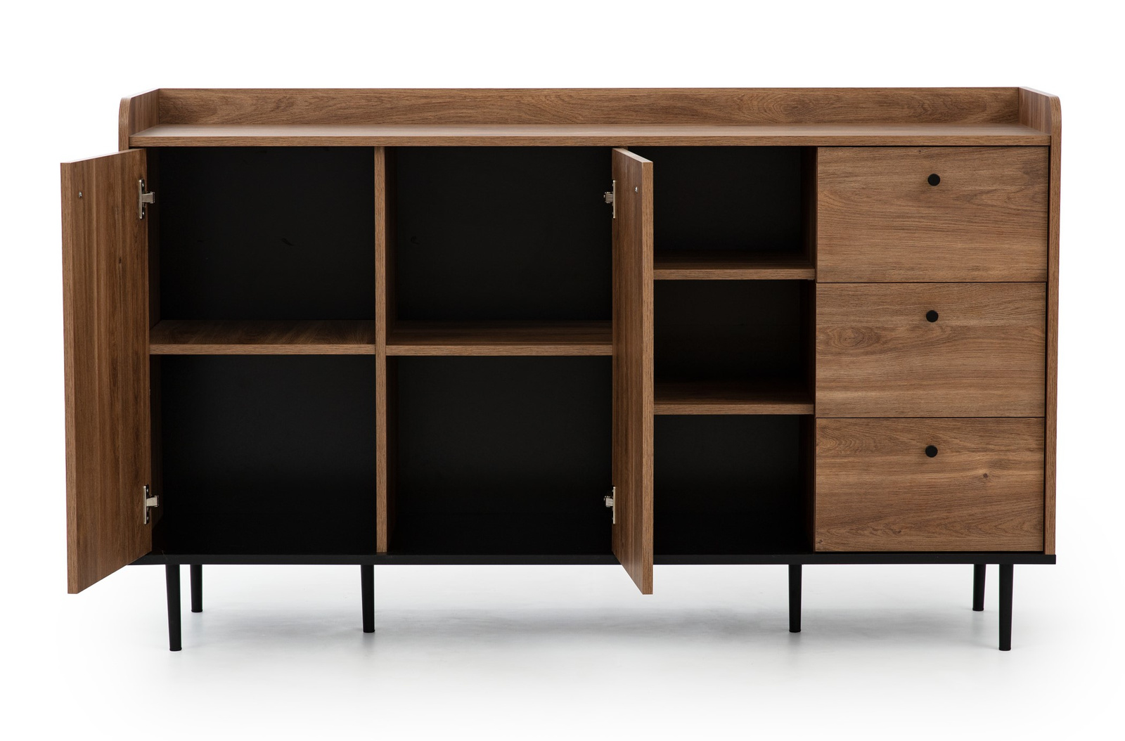 - Die stilvolle Kommode Nero mit einer Breite von 150 cm, drei Schubladen und Doppeltüren verfügt über: - Metallbeine und -griffe, - hohe Verarbeitungsqualität und 24 Monate Garantie, - leisen Schließmechanismus, - schönes Loft-Design im klassischen Stil