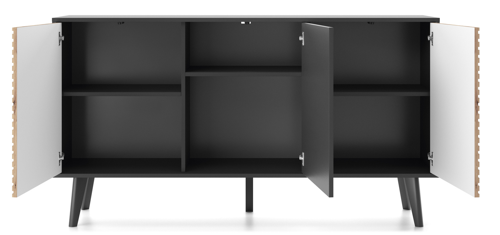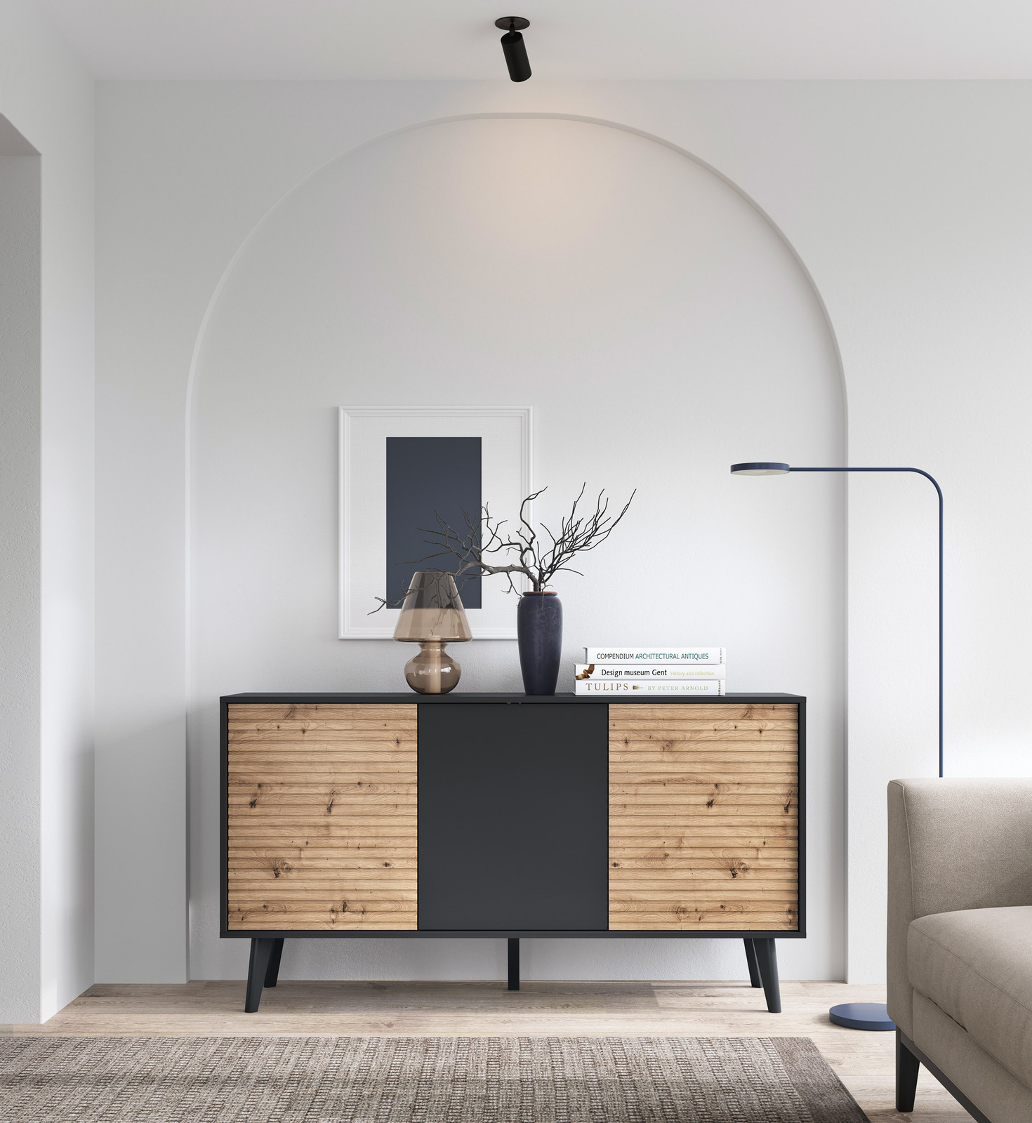 - Die 154 cm breite Kommode Maestro ist die Quintessenz von Eleganz und Funktionalität in einem. Ihre tiefe schwarze Farbe und die raffinierten, gefrästen Fronten in der Farbe Artisan Oak bilden eine Komposition, die auf den ersten Blick ins Auge fällt.
