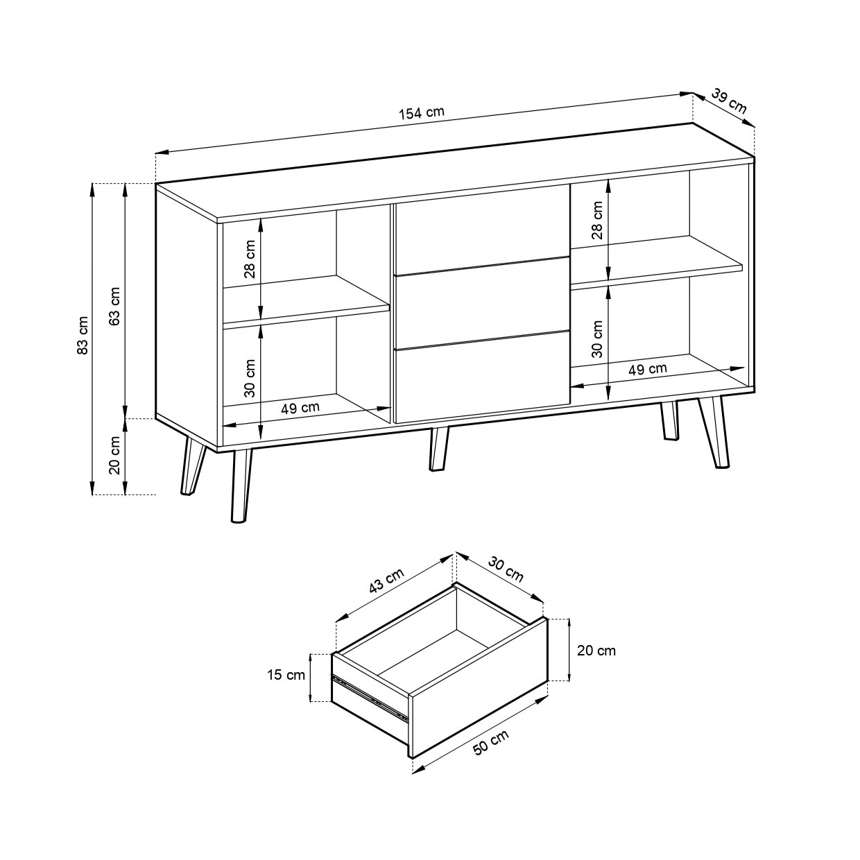 Stabile Holzfüße in Schwarz unterstreichen die Eleganz der Kommode und verleihen ihr zusätzliche Stabilität. Das grifflose Push-to-Open-Öffnungssystem macht die Benutzung der Kommode noch komfortabler und intuitiver.