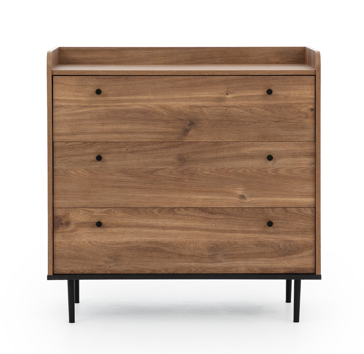 Die schöne Kommode Nero im Brandy Castello-Dekor verfügt über drei geräumige Schubladen mit Dämpfung. Die Kommode eignet sich hervorragend für das Wohnzimmer, das Schlafzimmer, aber auch für den Flur und den Kleiderschrank. Stilvolle Metallgriffe und -füße in Kombination mit einer modischen Farbe verleihen der Kommode einen Loft-Look.