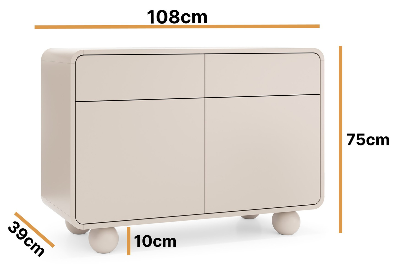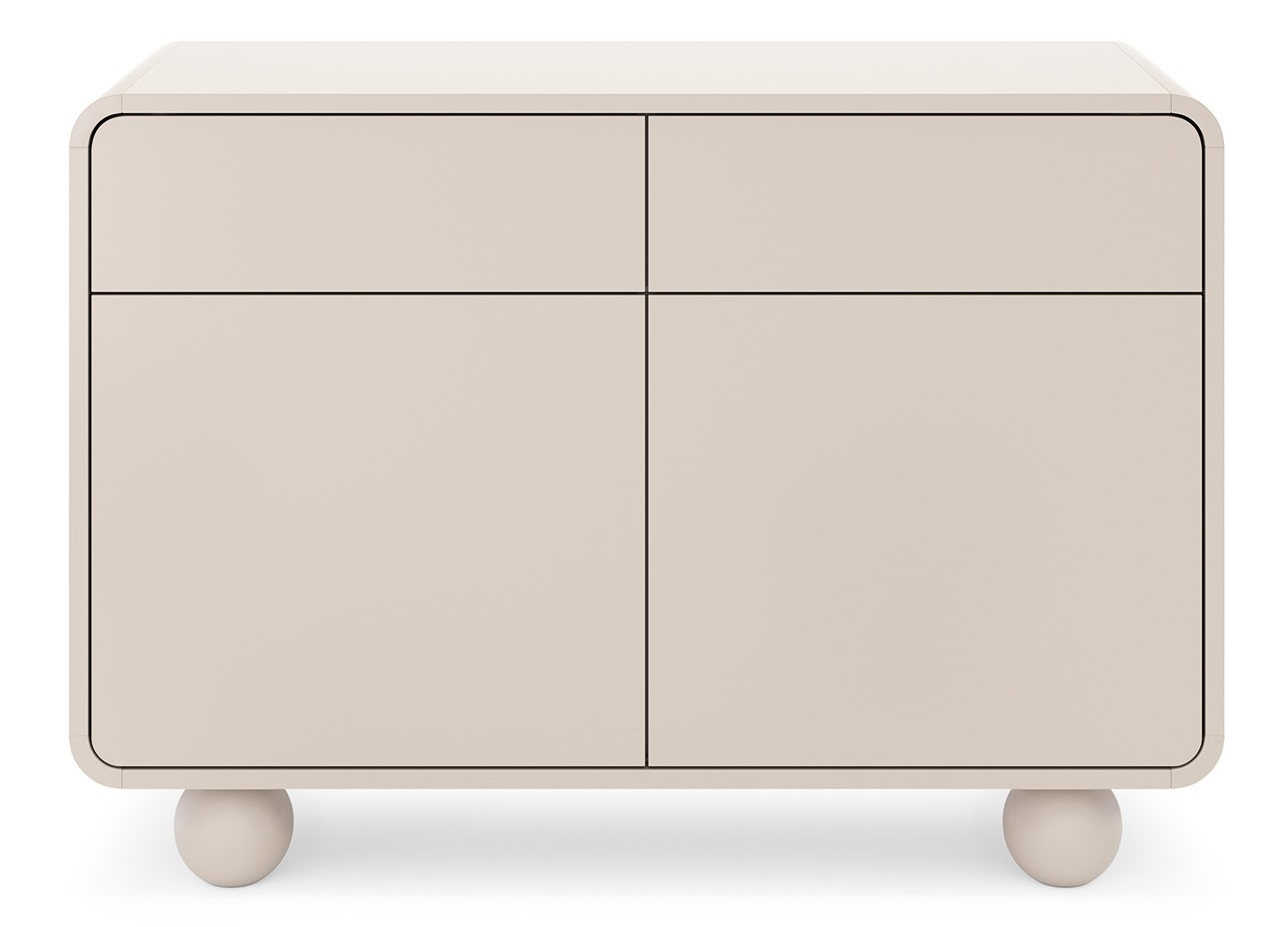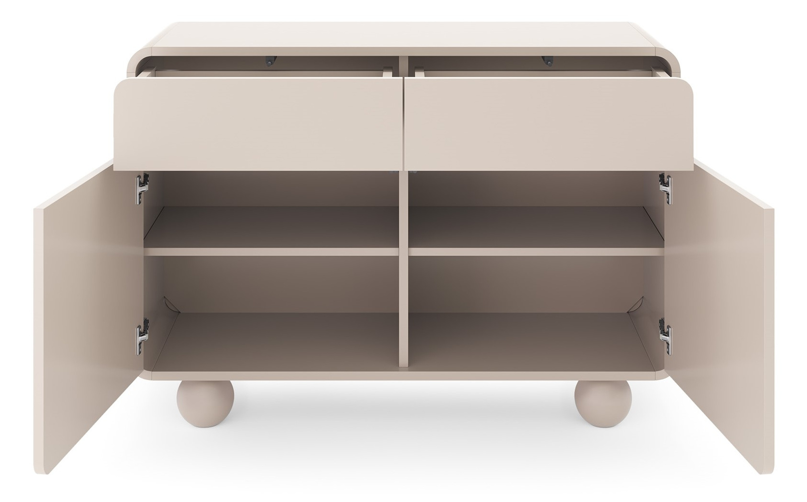 Die Orion-Kommode im eleganten Kaschmir-Ton besticht durch minimalistisches Design und abgerundete Linien. Auf den charakteristischen runden Füßen stehend, setzt sie einen modernen Akzent. Mit zwei praktischen Schubladen und geräumigen Fächern hinter Doppeltüren bietet sie viel Stauraum.
