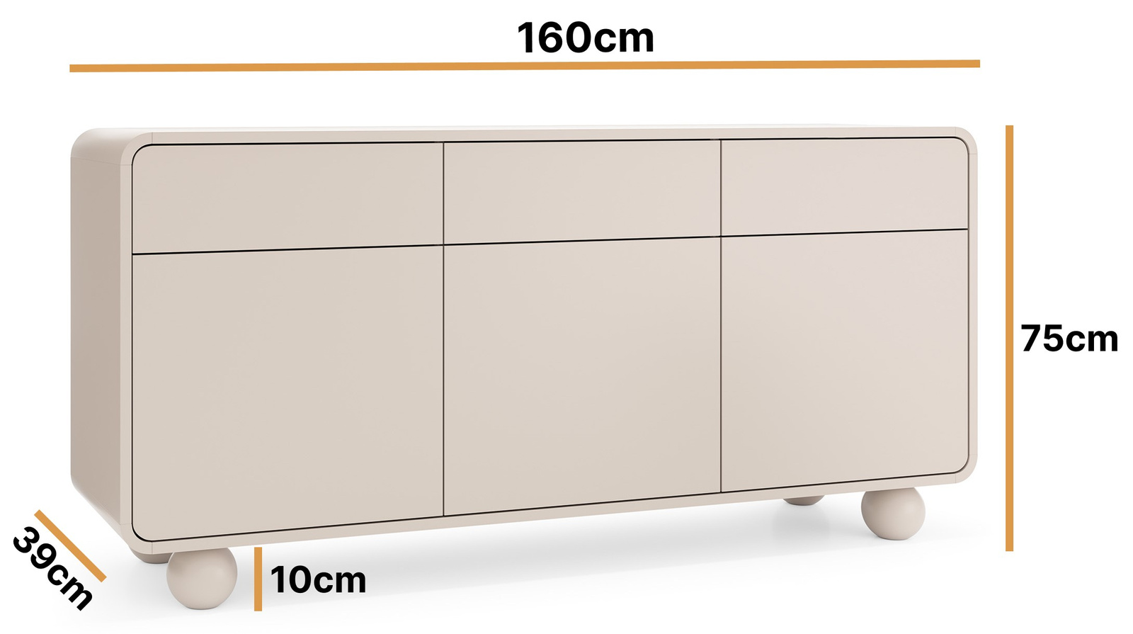Die Orion-Kommode in elegantem Kaschmir-Ton überzeugt mit minimalistischem Design und abgerundeten Linien. Auf den charakteristischen runden Füßen stehend, setzt sie einen modernen Akzent im Raum. Drei praktische Schubladen und geräumige Fächer hinter den drei Türen bieten viel Stauraum.