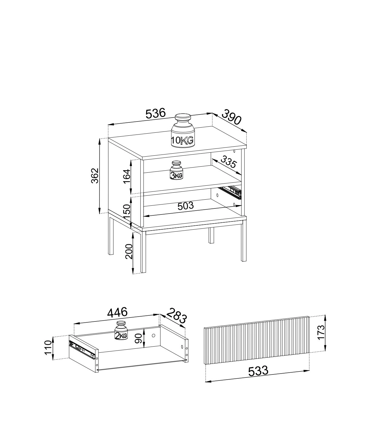 - Nachttisch Wotan-Eiche-Schwarz: geriffelte Front der einzelnen Schublade, dezente LED-Beleuchtung unter der Tischplatte, die die Struktur betont und eine stimmungsvolle Atmosphäre schafft. Schlanke Beine – ein leichter, eleganter Akzent für ein modernes S