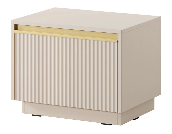 - Nachttisch Loren mit gefräster Front und goldenen Details. Die geräumige Schublade bietet praktischen Stauraum neben dem Bett. Ideal für moderne Innenräume.