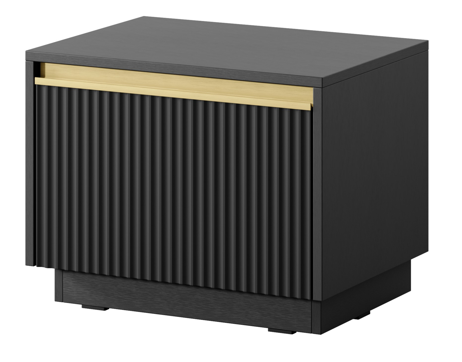 - Nachttisch Loren mit gefräster Front und goldenen Details. Die geräumige Schublade bietet praktischen Stauraum neben dem Bett. Ideal für moderne Innenräume.