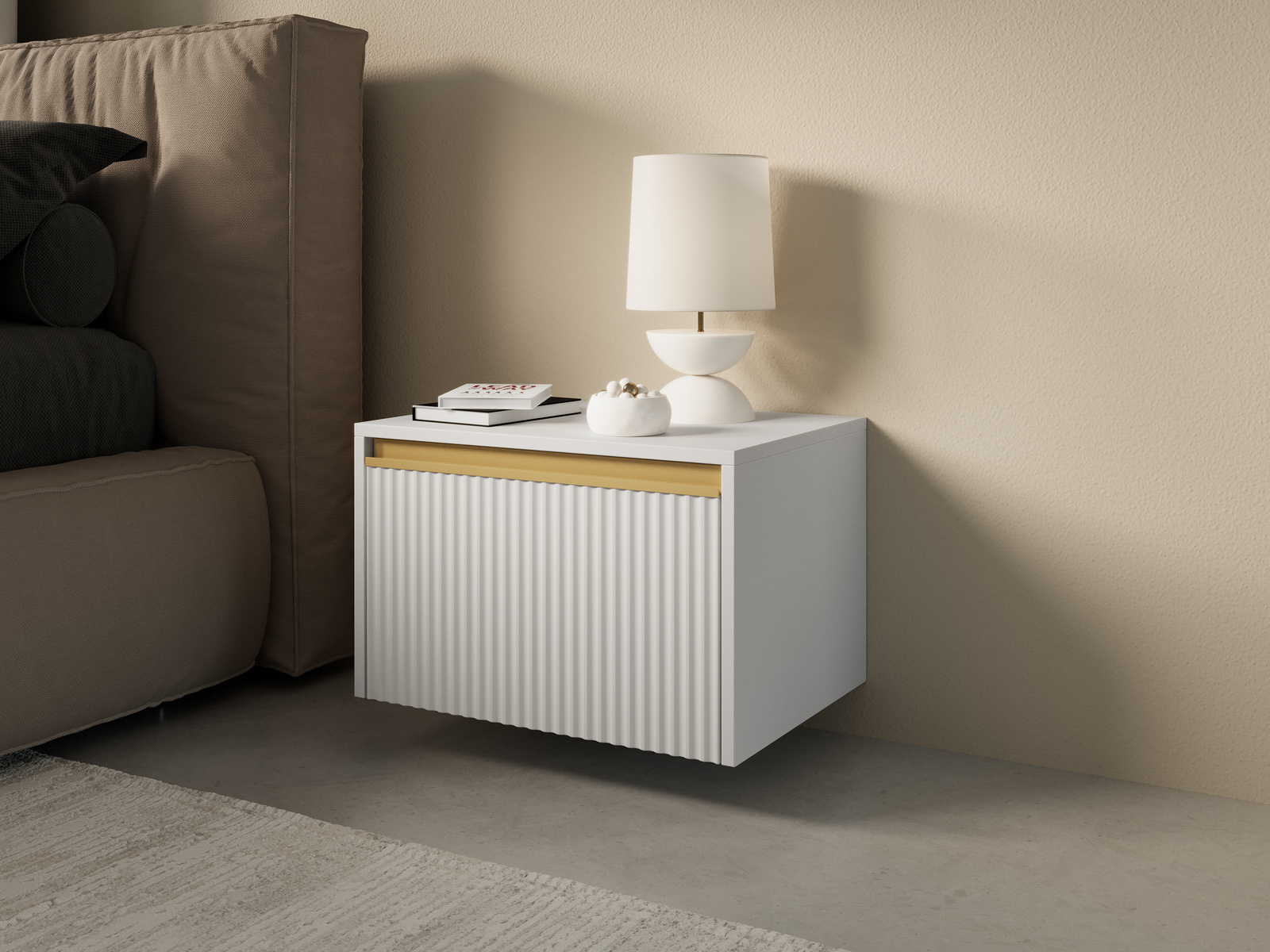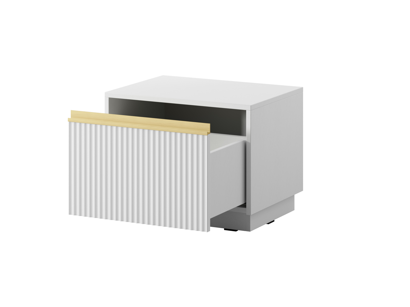- Nachttisch Loren mit gefräster Front und goldenen Details. Die geräumige Schublade bietet praktischen Stauraum neben dem Bett. Ideal für moderne Innenräume.