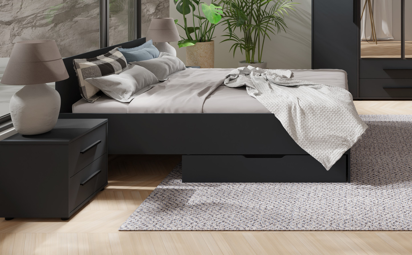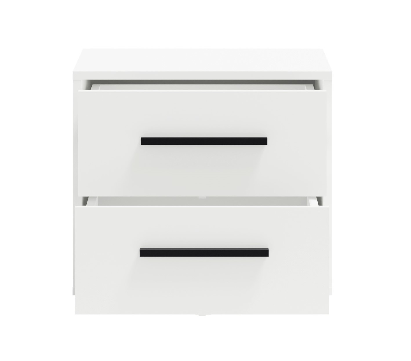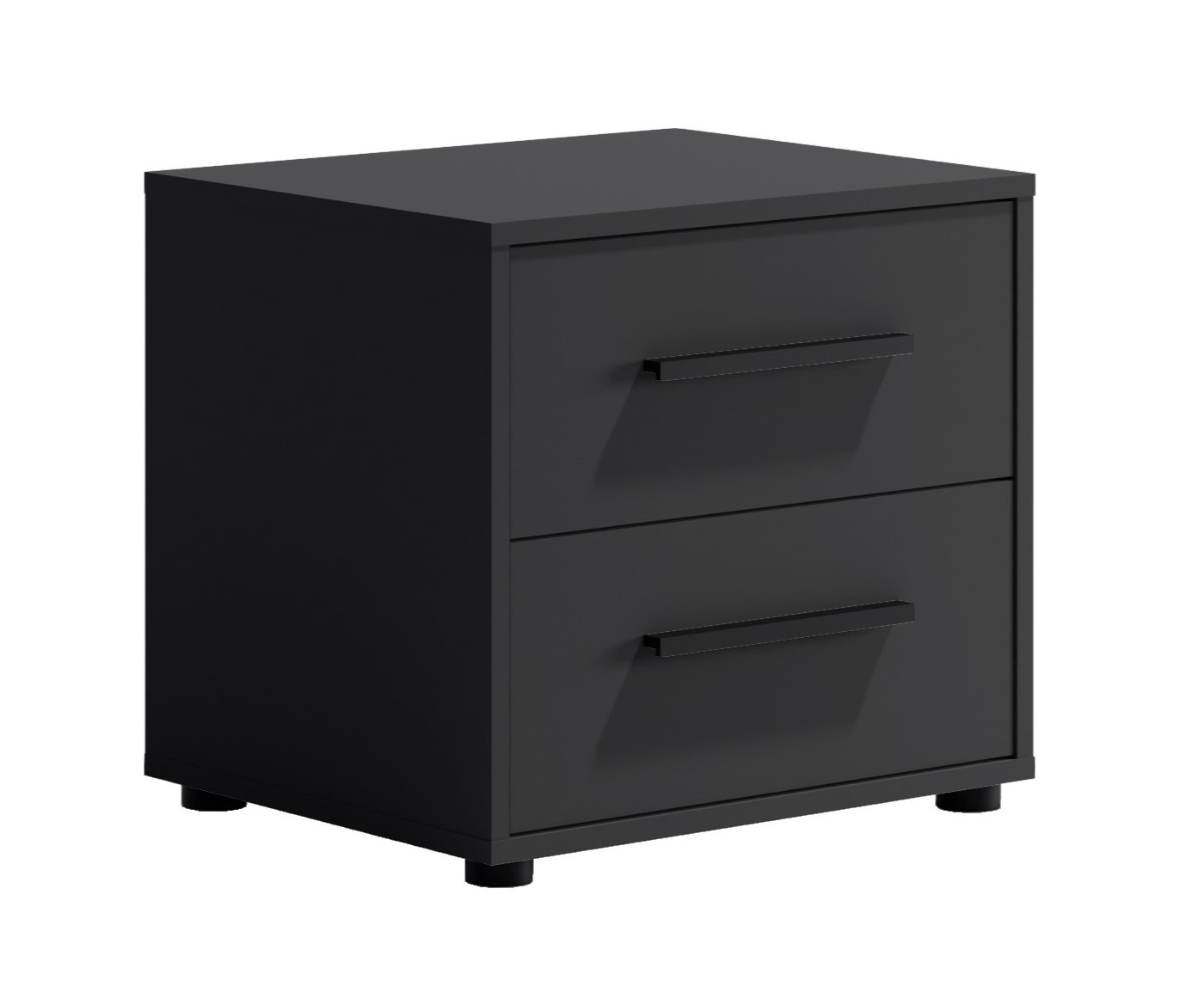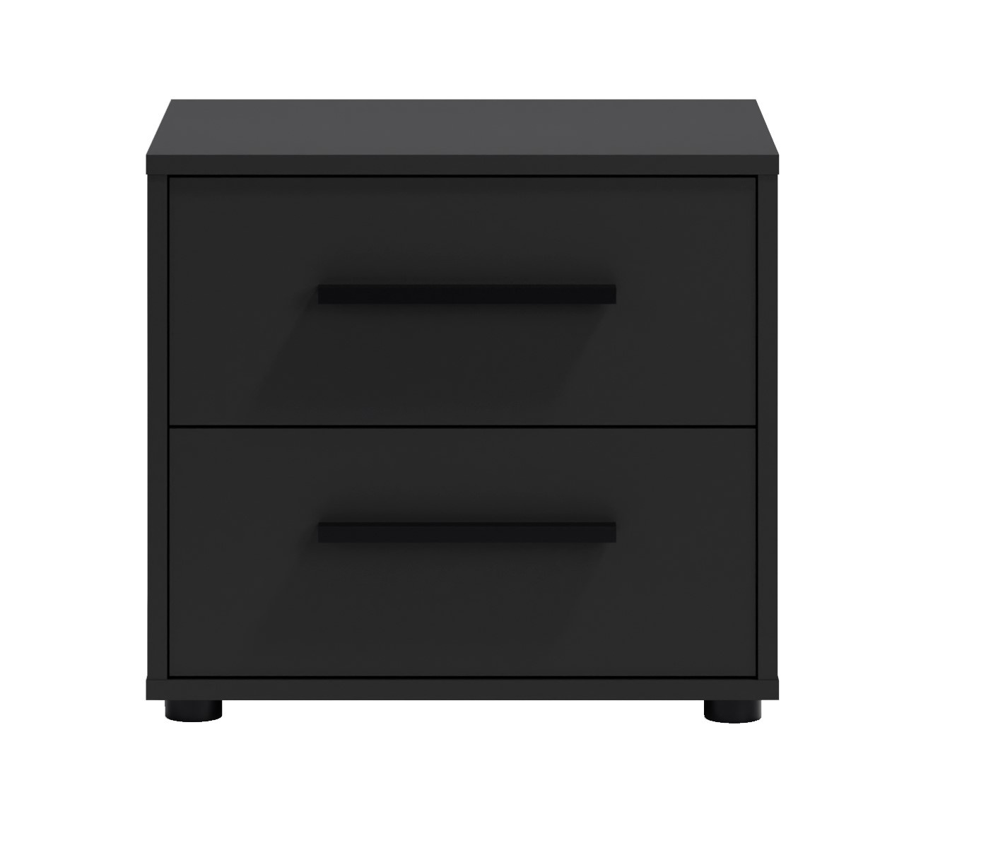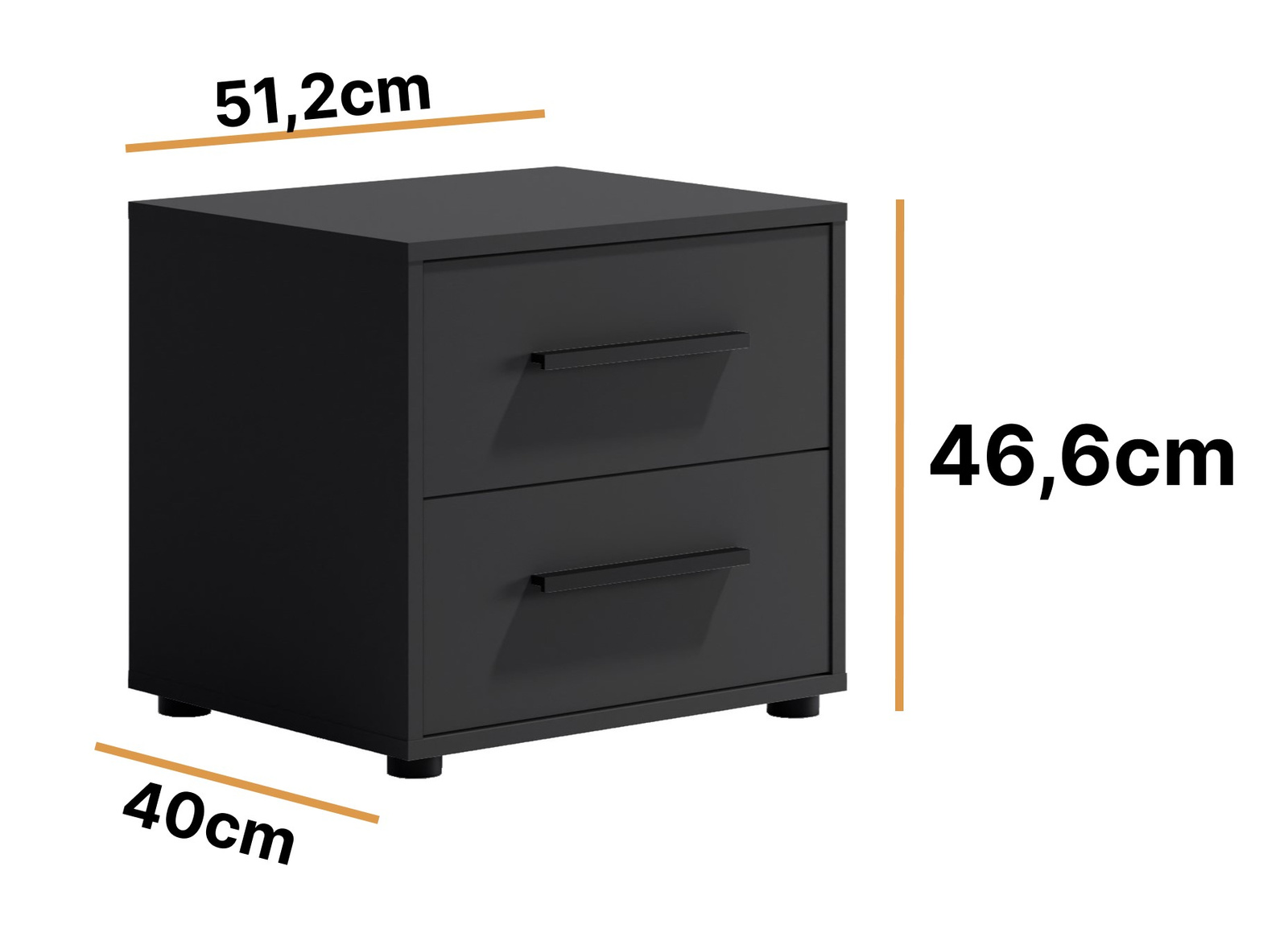 - Nachttisch Modena schwarz, 2 Schubladen, schwarze Griffe. Minimalistisch, geräumig und stilvoll – ideal für ein modernes Schlafzimmer.