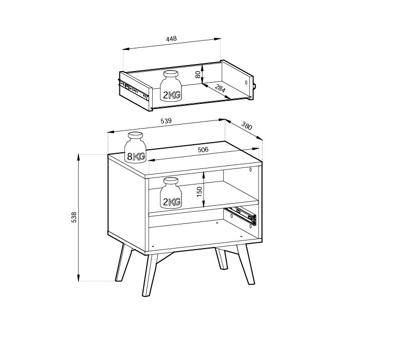 Der elegante, goldene Griff in Dreiecksform verleiht dem Ganzen einen einzigartigen Charakter. Das Möbelstück ist mit einer geräumigen Schublade und einem praktischen, offenen Regal ausgestattet, wodurch es sich ideal zur Aufbewahrung der wichtigsten Dinge neben dem Bett eignet. Die stabilen, schrägen Beine unterstreichen die Leichtigkeit der Konstruktion, und das Ganze passt sowohl in moderne als auch in skandinavische Innenräume.