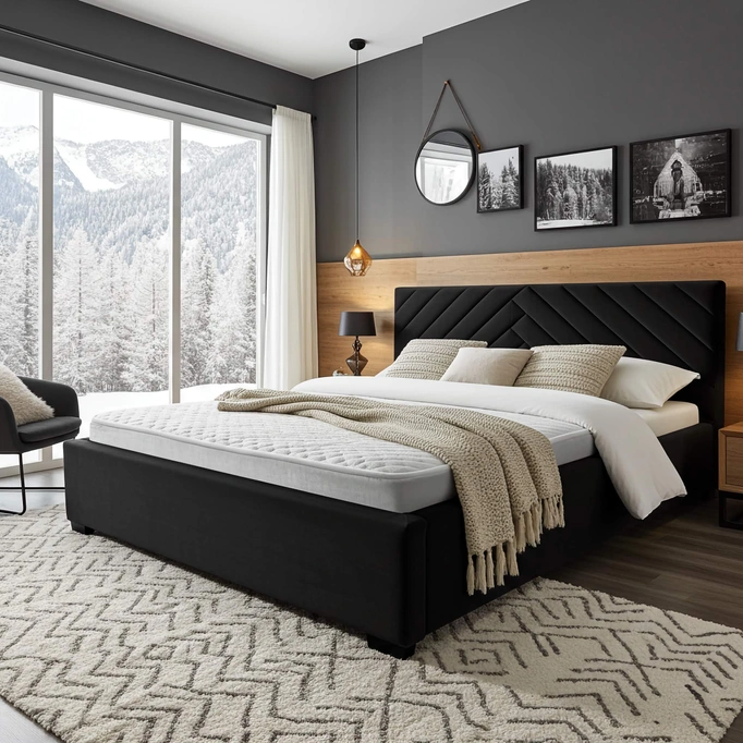 Mut, Geheimnis und Raffinesse – so lässt sich das schwarze Bett TODI 180x200 beschreiben. Ein Vorschlag für Liebhaber kompromissloser Lösungen und des Industrial-, Loft- oder minimalistischen Stils. Das tiefe Schwarz des Samts macht das Bett zum zentralen, dominanten Punkt des Schlafzimmers. Die Größe 180x200 sorgt für königlichen Komfort. Dies ist kein gewöhnliches Möbelstück – es ist ein Statement für Stil und Selbstbewusstsein.