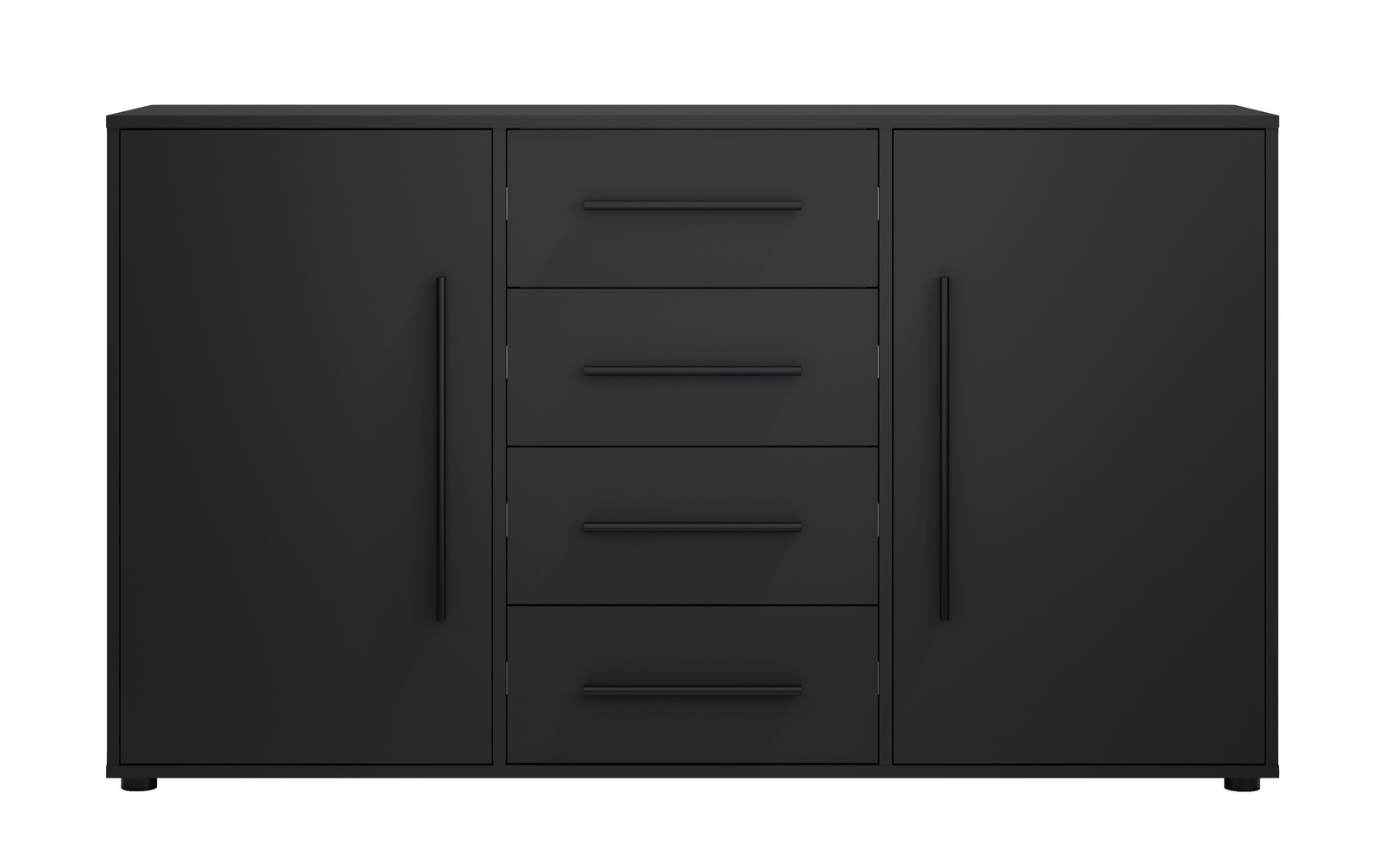 - Schwarze Kommode Modena mit 4 Schubladen und 2 Schränken. Modern, geräumig und vielseitig – ideal für Wohnzimmer, Schlafzimmer und Flur.