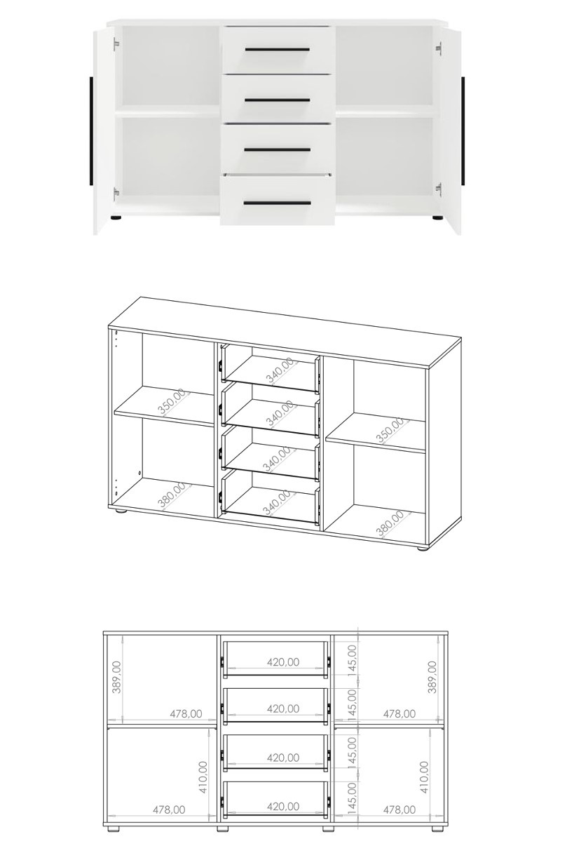 Ausgestattet mit vier geräumigen Schubladen in der Mitte und zwei seitlichen Schränken mit Einlegeböden bietet die Kommode maximale Funktionalität und Stauraumkomfort. Mit ihr können Sie den Raum in Ihrem Wohnzimmer, Schlafzimmer oder Flur ganz einfach organisieren und finden Platz für Kleidung, Unterwäsche, Dokumente oder andere Haushaltsaccessoires. Die breite Oberseite der Kommode ist ideal für Dekorationen, Pflanzen, Lampen oder Ihre Lieblingsfotorahmen, die dem Raum eine individuelle Note verleihen.