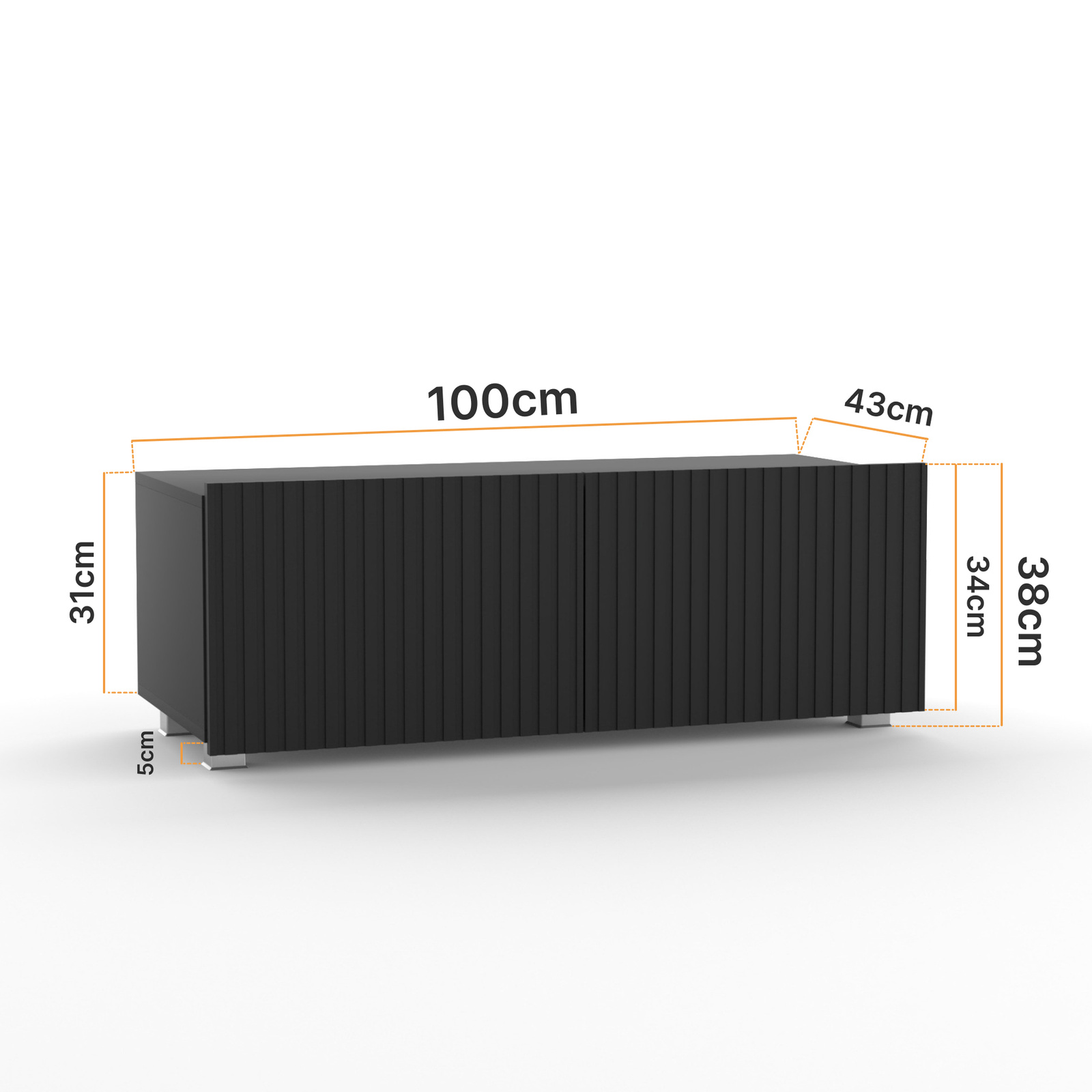 - Der TV-Schrank Kolder 100 cm mit schwarzen geriffelten Fronten ist ein stilvolles und funktionales Möbelstück. Er besteht aus Möbelplatte und MDF, verfügt über einen leisen Verschluss und optionale Füße für die Aufstellung oder Aufhängung. Ideal für moder