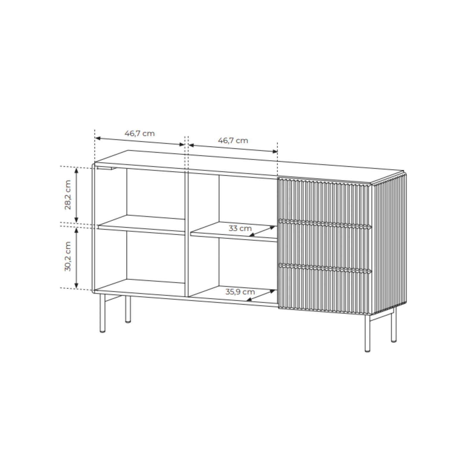 Ein Highlight sind die geriffelten Fronten aus MDF-Platte, die eine eindrucksvolle, dreidimensionale Struktur schaffen. Die Form ist absolut minimalistisch – auf Griffe wurde zugunsten des komfortablen Push-to-Open Systems verzichtet. Das Ganze ruht auf stabilen, schwarzen Metallbeinen, die dem Möbelstück Leichtigkeit verleihen.