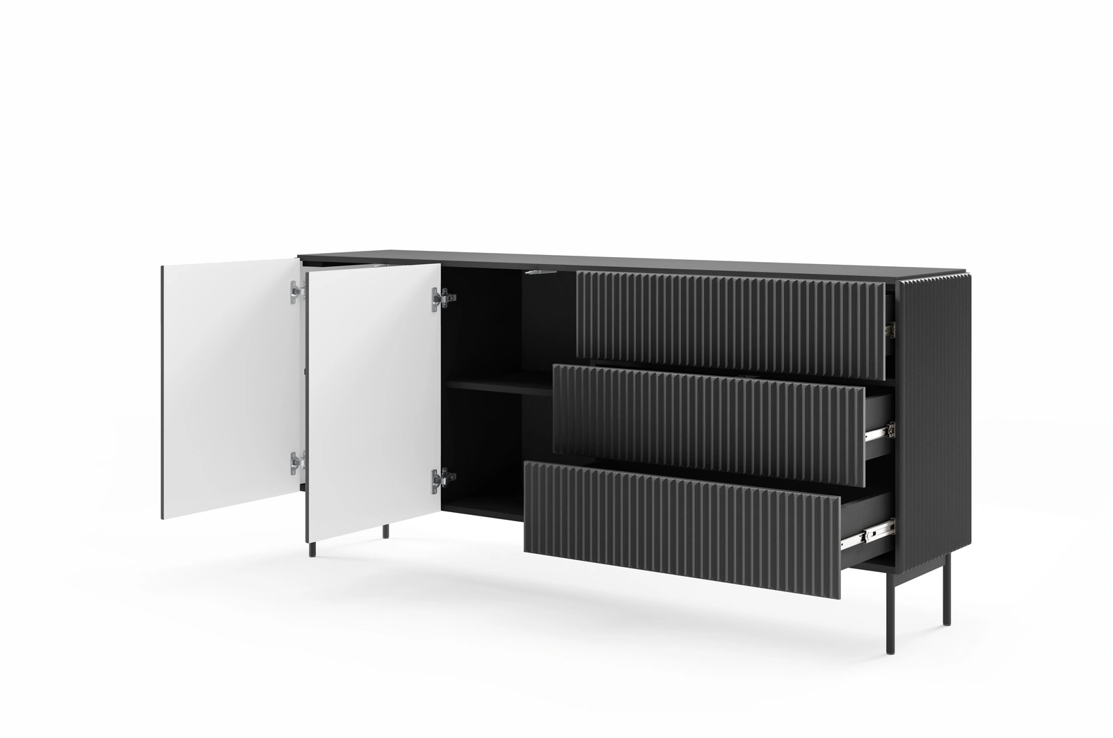 Die Fronten sind aus hochwertiger geriffelter MDF-Platte (18 mm) gefertigt. Die vertikalen Rillen sorgen für ein interessantes Lichtspiel. Die moderne Form wird durch den Verzicht auf Griffe unterstrichen – hier kommt das komfortable Push-to-Open System zum Einsatz. Das Ganze steht auf stabilen, schwarzen Metallbeinen.