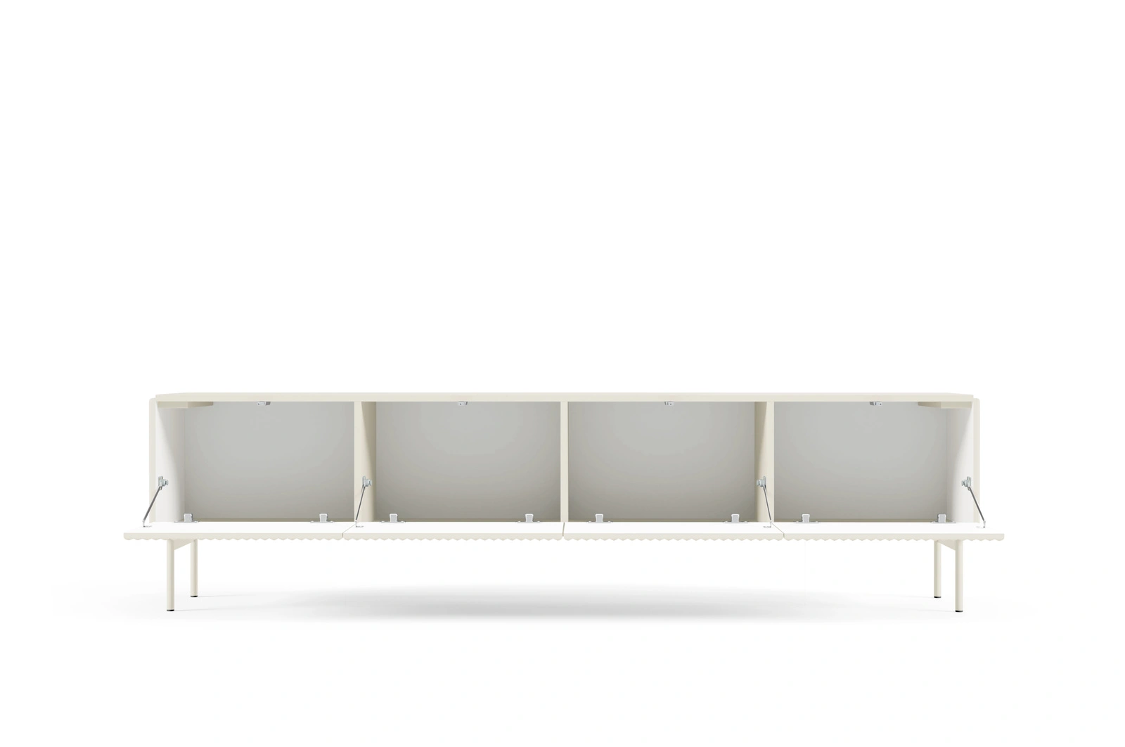 - Das breite TV-Lowboard MUTI (195 cm) in Kaschmir Beige bietet Platz für große Fernseher. 4 Türen mit moderner Riffeloptik (MDF) und Push-to-Open System. Beige Metallbeine sorgen für einen eleganten Look. Perfekt für Japandi-Wohnzimmer.