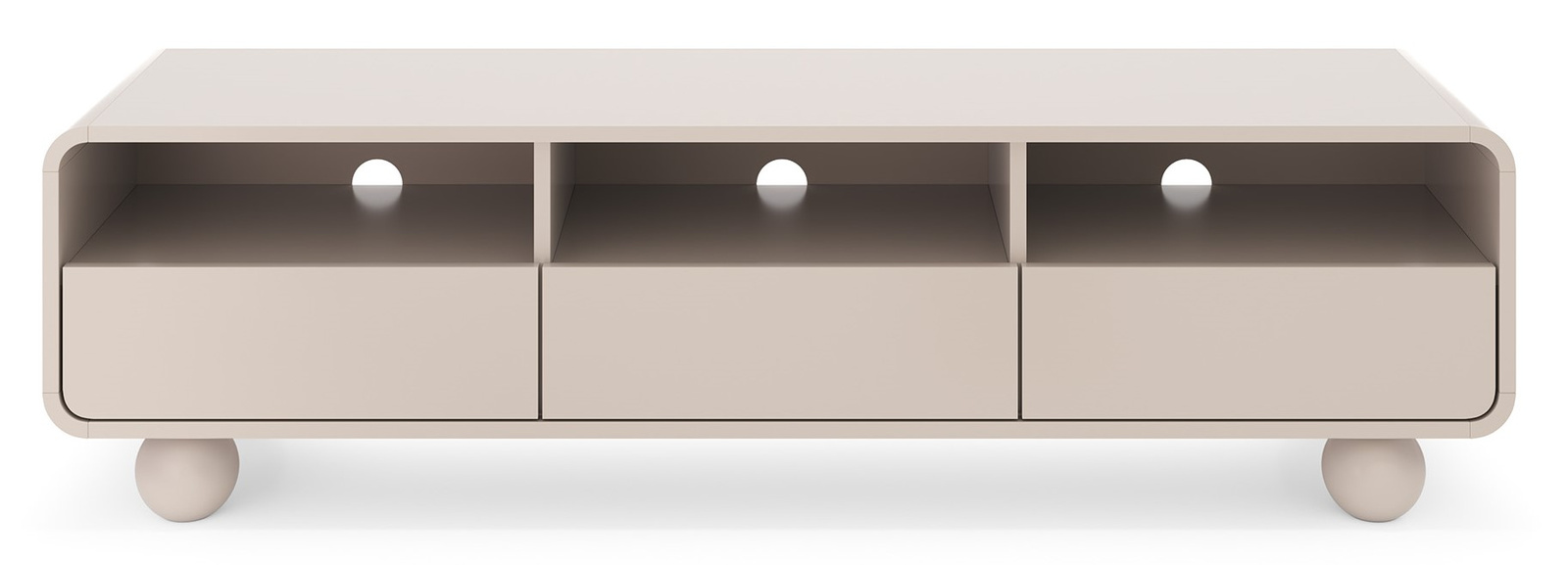 Der TV-Schrank Orion in der Farbe Kaschmir verbindet minimalistische Eleganz mit Funktionalität. Seine abgerundeten Kanten und runden Füße verleihen ein modernes, designorientiertes Aussehen. Die helle Farbgebung passt perfekt zu verschiedenen Wohnstilen. Drei geräumige Schubladen bieten Platz für Zubehör, während die offenen Fächer mit Kabeldurchführungen ideal für Multimedia-Geräte sind.
