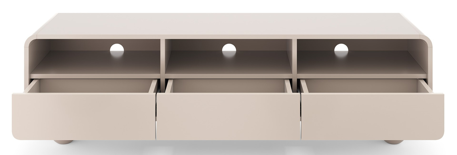 • Das TV-Board Orion in der Farbe Kaschmir ist ein elegantes Möbelstück mit drei Schubladen und offenen Fächern für Multimedia-Geräte. Das moderne Design mit abgerundeten Linien und runden Füßen ergänzt jedes Wohnzimmer perfekt.