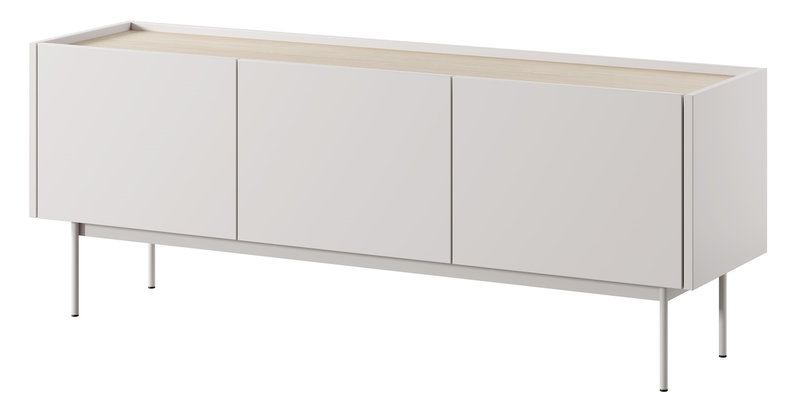 - Moderner TV-Schrank in Kaschmirfarbe mit Eichenholz-Innenausstattung. Minimalistische Form, drei Fronten ohne Griffe und schlanke Füße. Eine stilvolle und funktionale Wahl für Ihr Wohnzimmer.