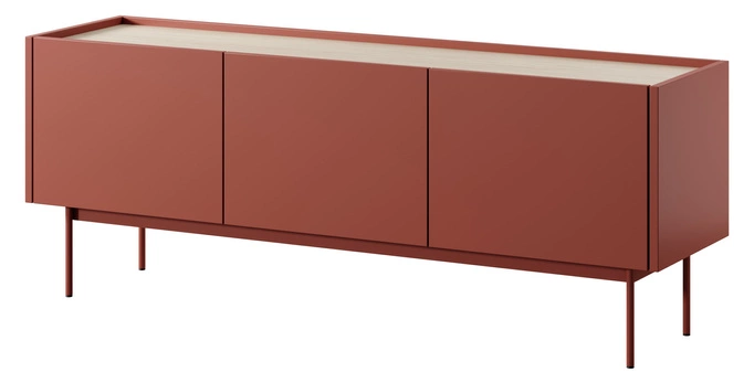 - Moderner TV-Schrank in Ceramic Red mit Innenausstattung in Eiche. Minimalistische Form, drei Fronten ohne Griffe und schlanke Füße. Eine stilvolle und funktionale Wahl für Ihr Wohnzimmer.
