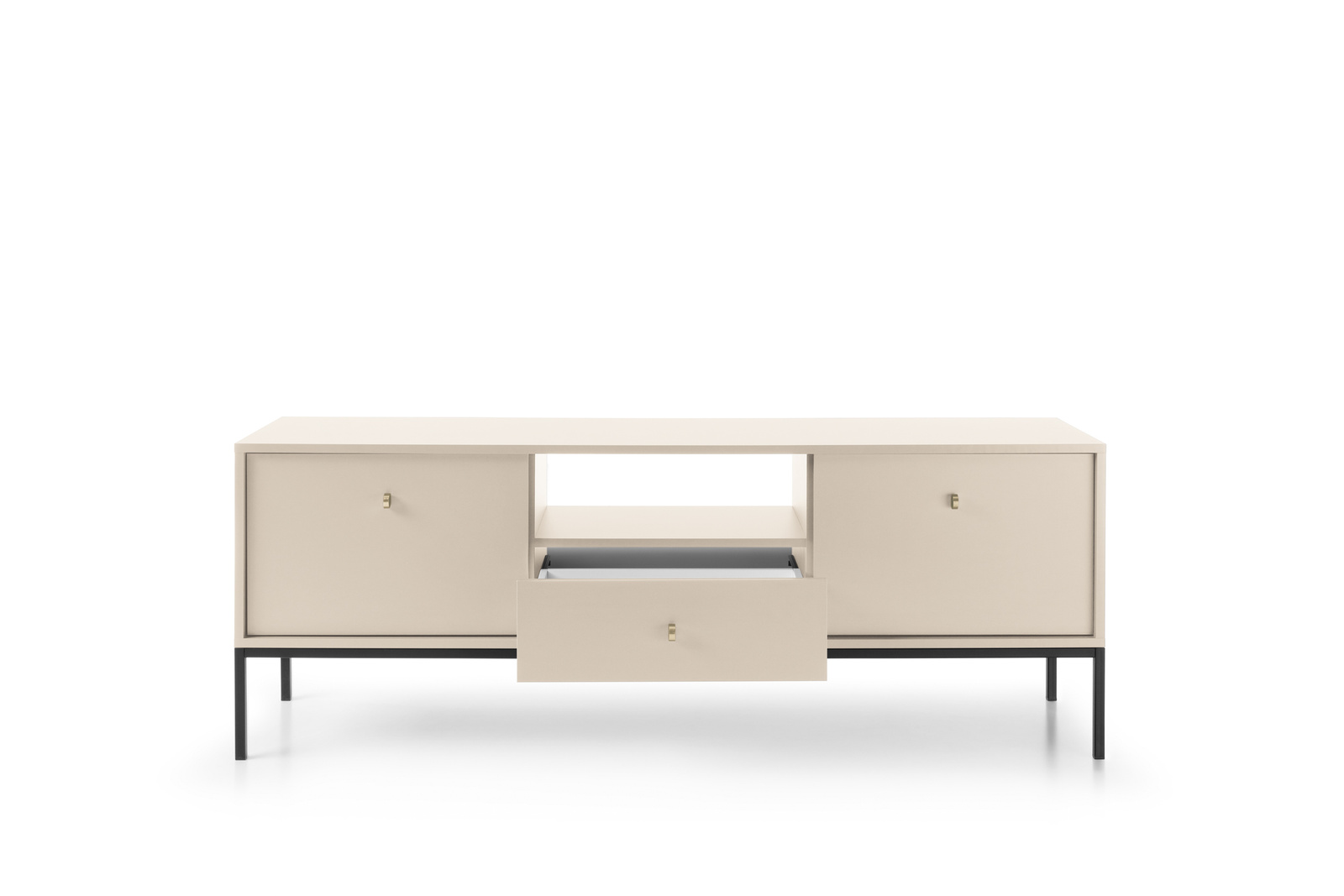 Mit zwei Türen und einer Schublade in der Mitte bietet der TV-Schrank Bari viel Platz für die Aufbewahrung von Elektronikgeräten und Zubehör. Stilvolle Griffe aus Aluminium verleihen dem Möbelstück Eleganz, während die soliden Metallfüße in Schwarz für Stabilität und Langlebigkeit sorgen.