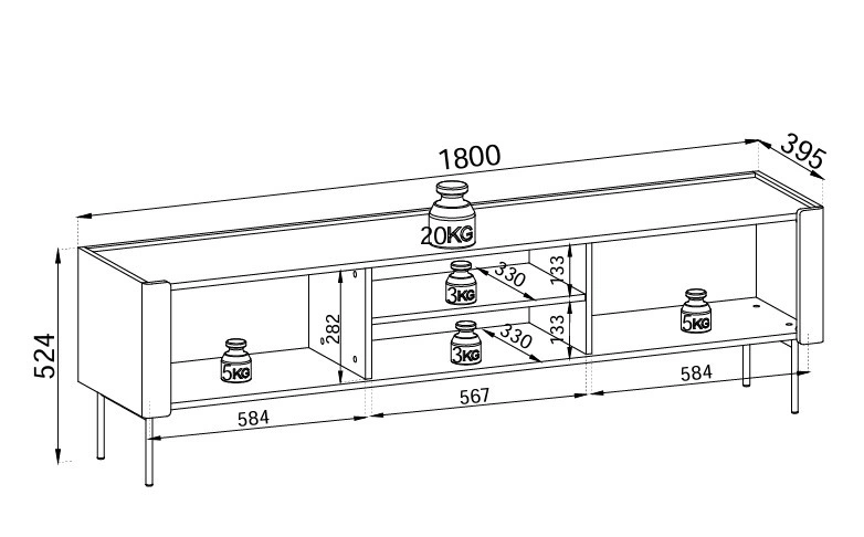 Der Schrank ist ausgestattet mit zwei offenen Regalböden mit Kabeldurchführung – ideal für einen Decoder, eine Konsole oder andere Multimedia-Geräte – sowie drei Schränken, in denen alle Kleinigkeiten diskret verstaut werden können. Das Push-to-Open-System sorgt für Bedienkomfort, und hohe Metallfüße verleihen der gesamten Konstruktion Leichtigkeit und erleichtern die Reinigung unter dem Möbelstück.