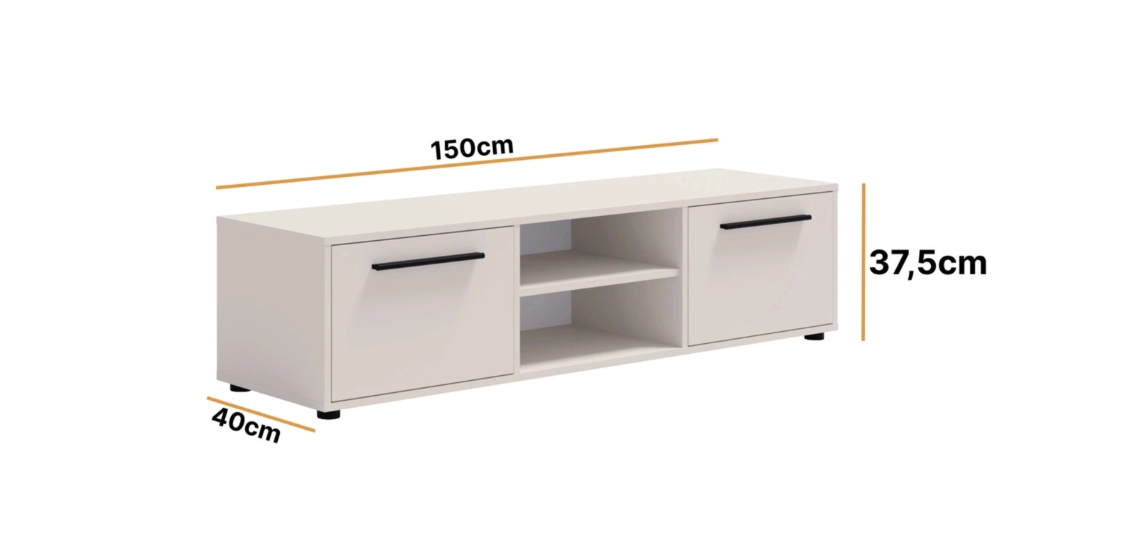 Das Modell ist mit zwei verschließbaren Seitenschränken und einem offenen, in zwei Ebenen unterteilten Mittelfach ausgestattet, in dem Sie bequem Ihre TV-Geräte, Konsolen, Decoder und anderes Zubehör verstauen können. Die 150 cm lange Abstellfläche bietet problemlos Platz für einen Fernseher und Dekorationen, sodass Sie einen ästhetischen und funktionalen Raum in Ihrem Wohnzimmer gewinnen.