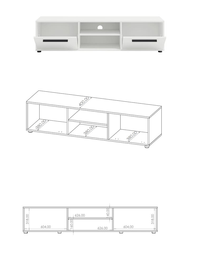Das Modell ist mit zwei verschließbaren Seitenschränken und einem offenen, in zwei Ebenen unterteilten Mittelfach ausgestattet, in dem Sie bequem Ihre TV-Geräte, Konsolen, Decoder und anderes Zubehör verstauen können. Die 190 cm lange Abstellfläche bietet problemlos Platz für einen Fernseher und Dekorationen, sodass Sie einen ästhetischen und praktischen Raum in Ihrem Wohnzimmer gewinnen.